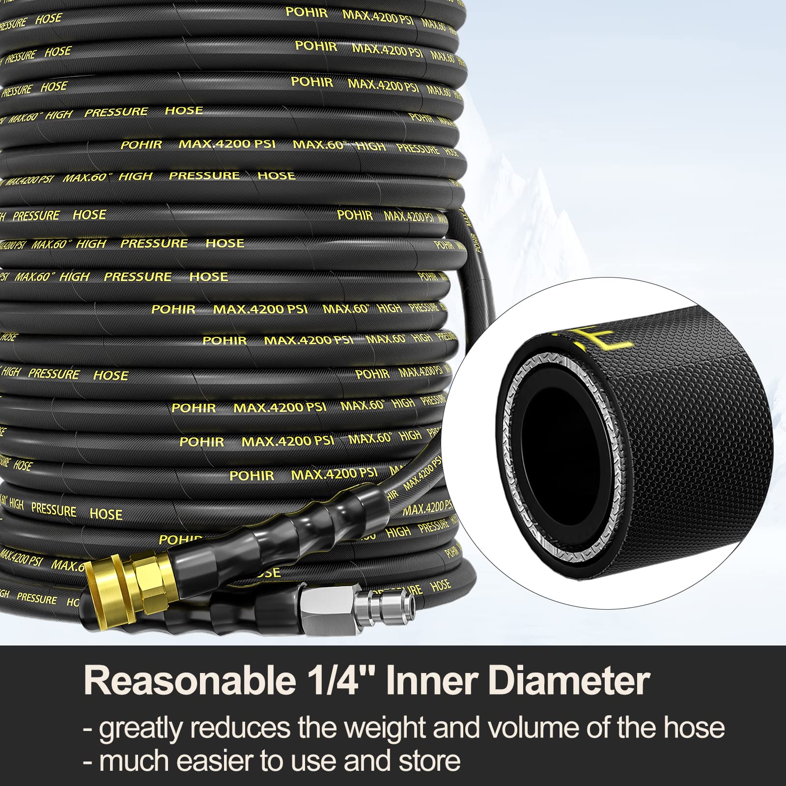 【Pressure Washer Hose150 FT】The pressure washer hose 150 feet is high tensile wire braided, it's durable and able to support quite high working pressure. Inner tube is reinforced with synthetic rubber. Its innovative high-tech materials and processes can extend the service life and are safe to use, suitable for household cleaning & commercial use. Reasonable selection of 1/4" inner diameter greatly reduces the weight and volume of the hose body, making it more convenient to use and storage.