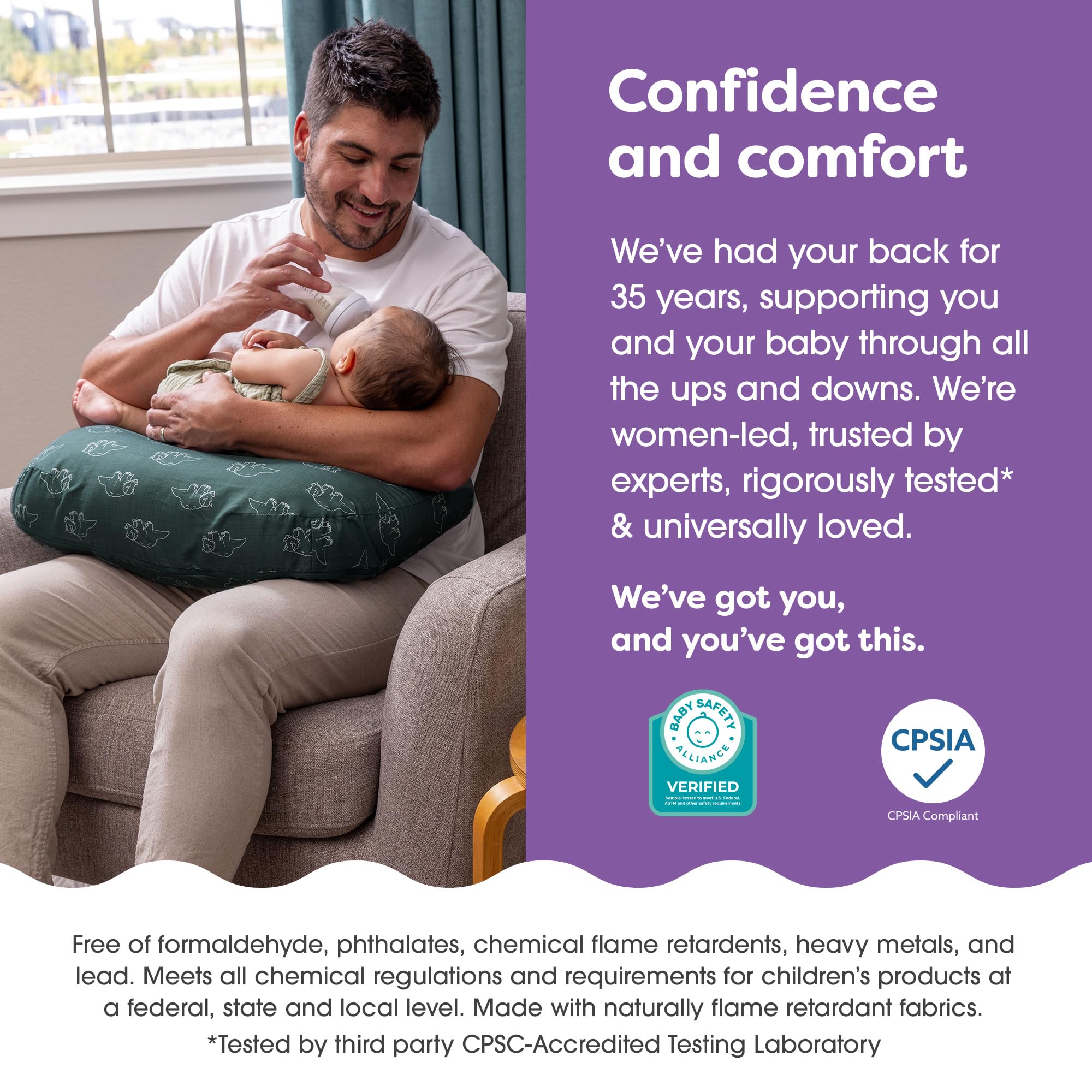 35 Years of Confidence: Better connecting babies and moms since 1989 with breastfeeding pillows, baby carriers and other baby essentials so you can worry less and enjoy more; The first brand verified by the Baby Safety Alliance in the Nursing Pillow category for meeting the highest standards in safety, performance and quality; Meets and exceeds standards for ASTM F3669 Consumer Safety Specification for Nursing Pillows and 16 CFR 1242 safety standard for nursing pillows, so you can have peace of mind