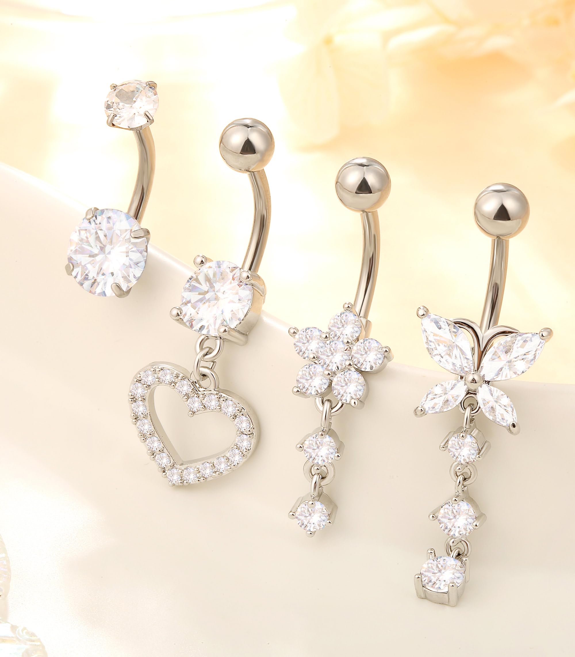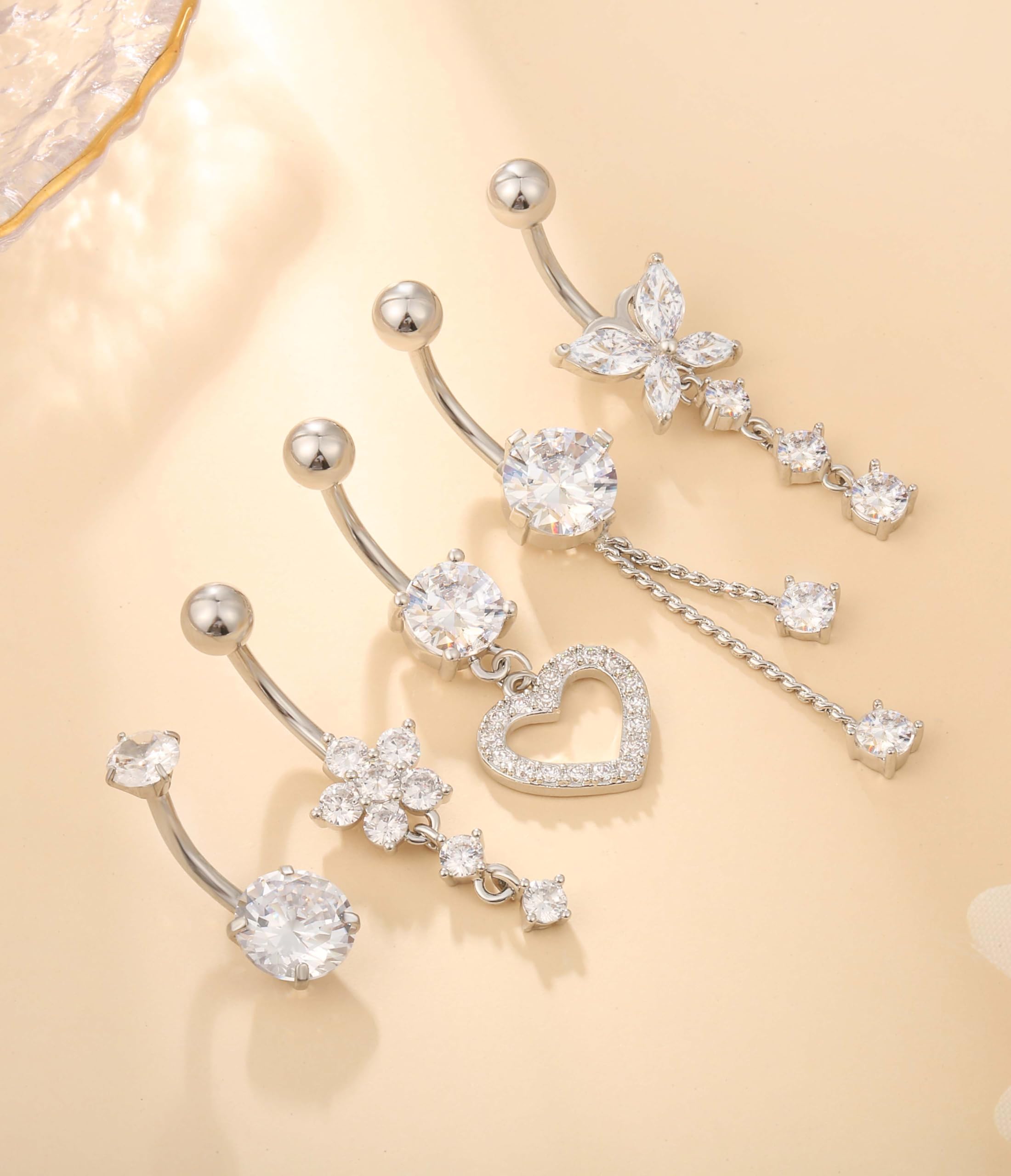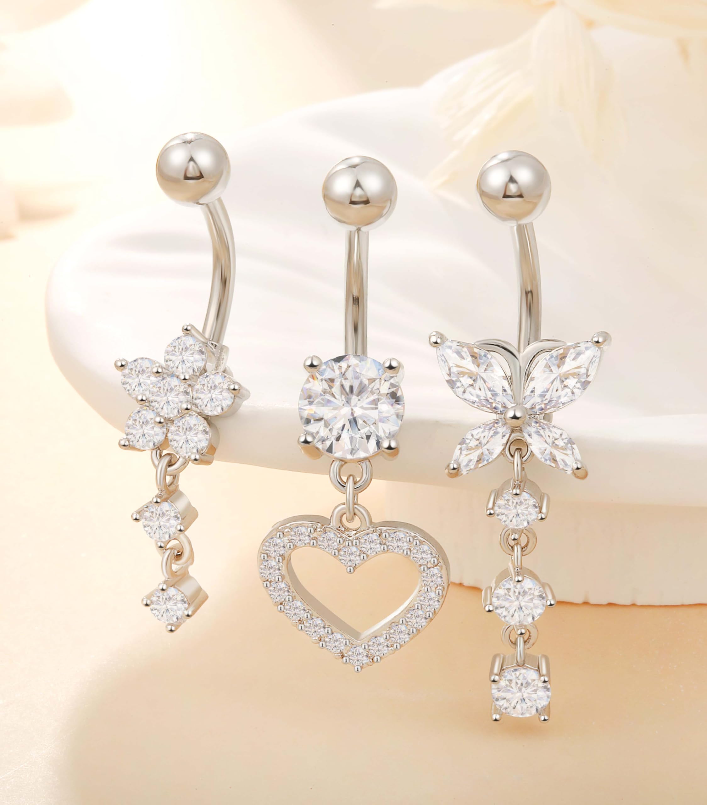 Mesmerizing dangle design: Adorned with captivating heart, flower, and butterfly charms, our belly rings create a mesmerizing and eye-catching effect as they dangle gracefully from your belly button piercing.