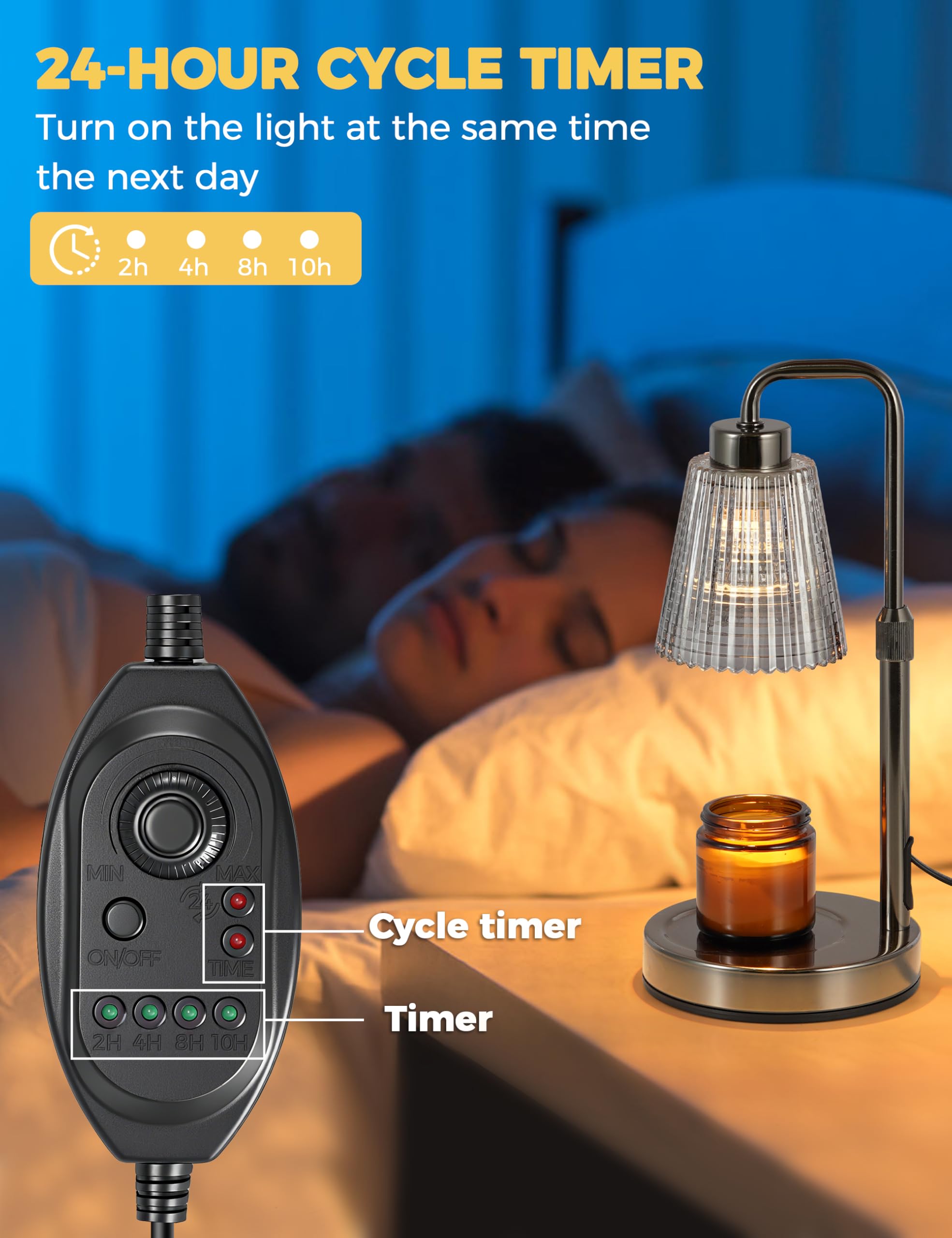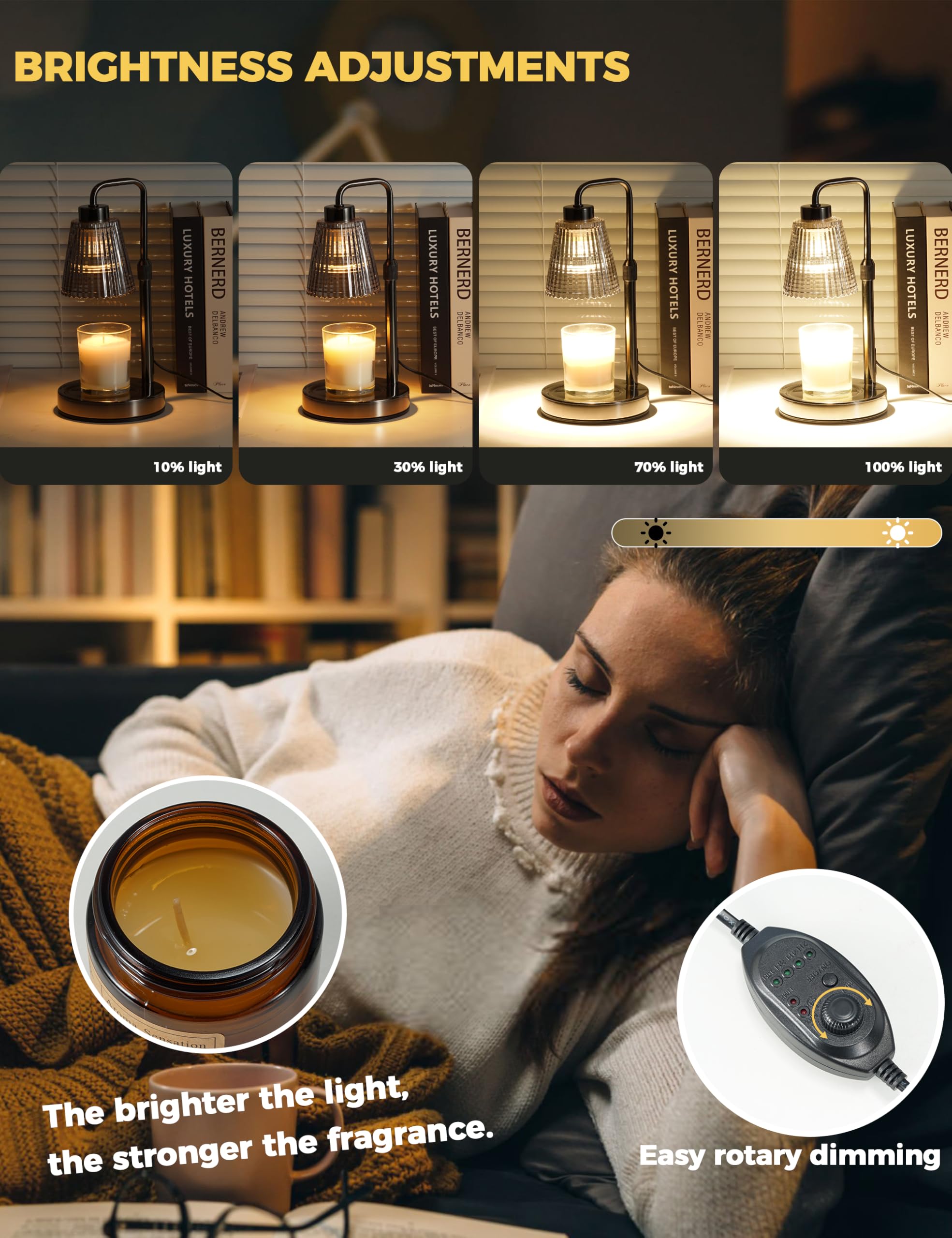 Fully Dimmable and 12-Hour Timing Function: Enjoy complete control over the ambiance with our dimmable knob, offering unrestricted dimming for personalized melting speeds. Additionally, our Candle+Warmer+Lamp boasts a convenient timer function, ensuring a perfect atmosphere tailored to your preferences, facilitating uninterrupted sweet dreams.