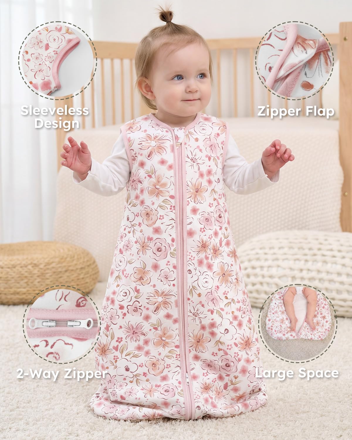 2-Way Zipper and Available Sizes: The top-grade double zipper allows unzip from the bottom for fuss-free diaper changes without disturb baby during the night, and design with zipper garage to protect baby’s face from chafing. There are 4 available sizes for this baby sleep sacks; S for 0-6 Months. M for 6-12 Months. L for 12-18 Months. XL for 18-24 Months.