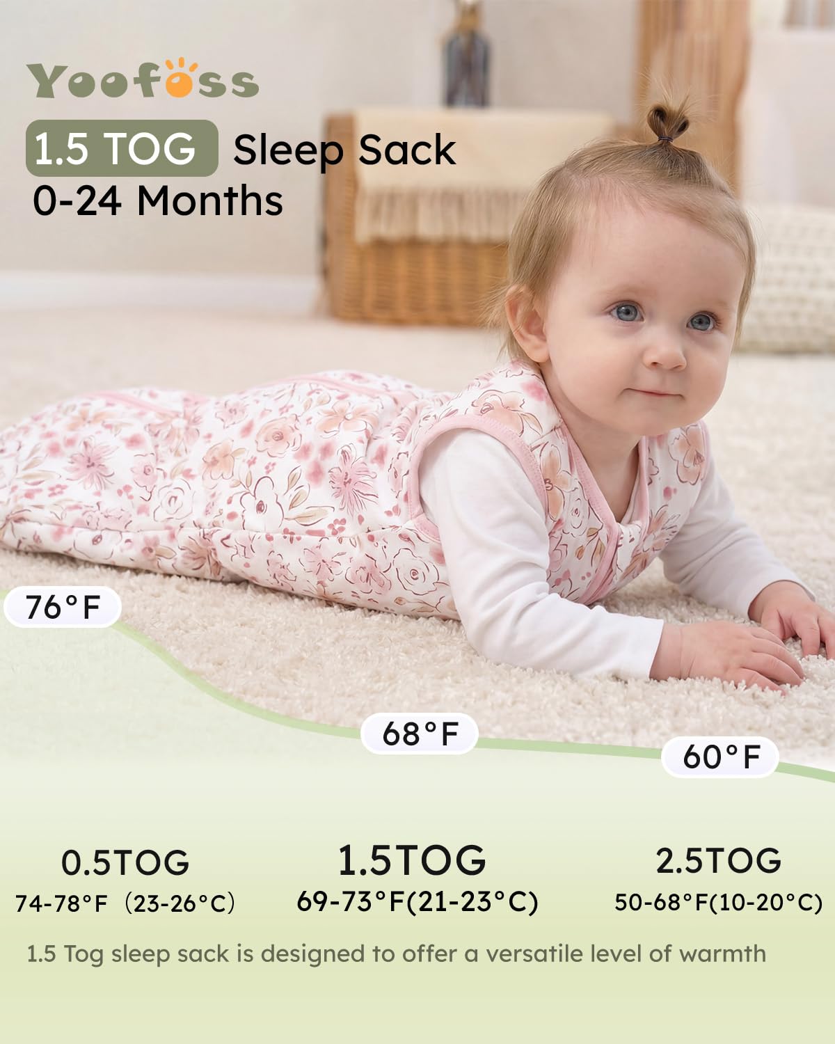 4-Season Use: 1.5 Tog sleep sack is suiable for moderate temperatures from 69 to 73°F as an ideal option for autumn,early winter and spring or taking a nap in air-conditioned rooms during the summer, keeping your baby snug and warm.