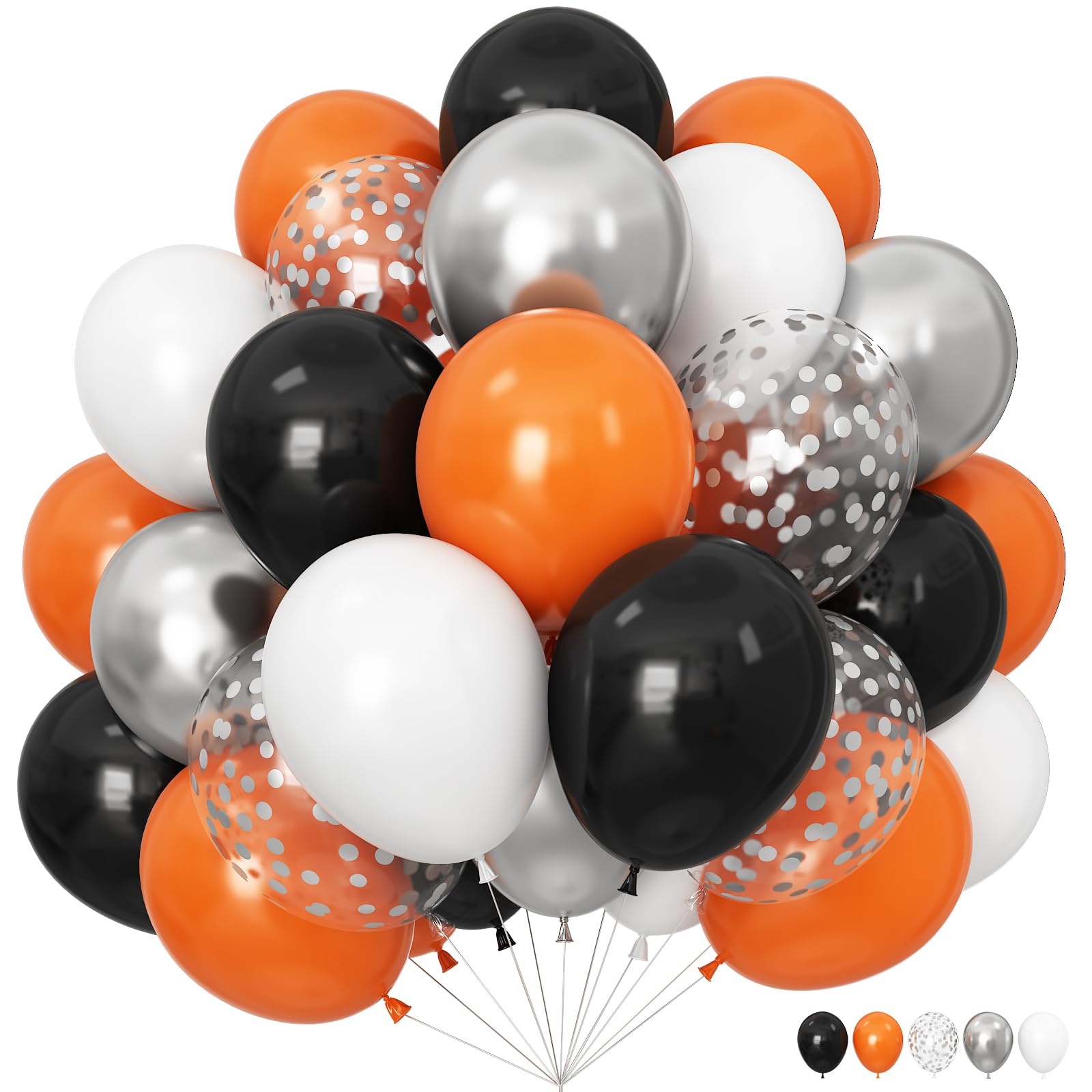 WHAT YOU GET: Orange black white silver balloons set includes 60pcs latex balloons: 15pcs 12inch orange balloons, 15pcs 12inch black balloons, 15pcs 12inch matte white balloons, 8pcs 12inch metallic silver balloons, 7pcs 12inch silver confetti balloons, 1 roll of ribbon, ideal for making balloon garland, balloon arch