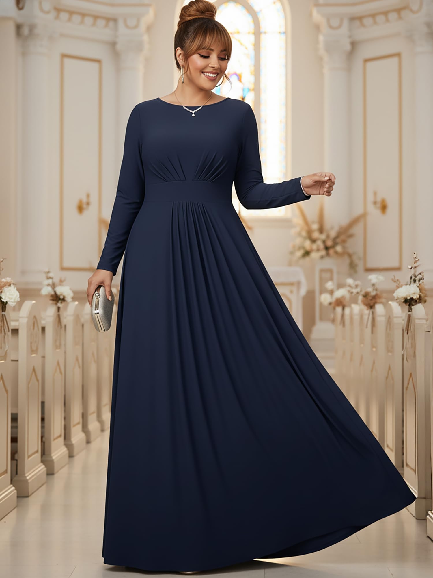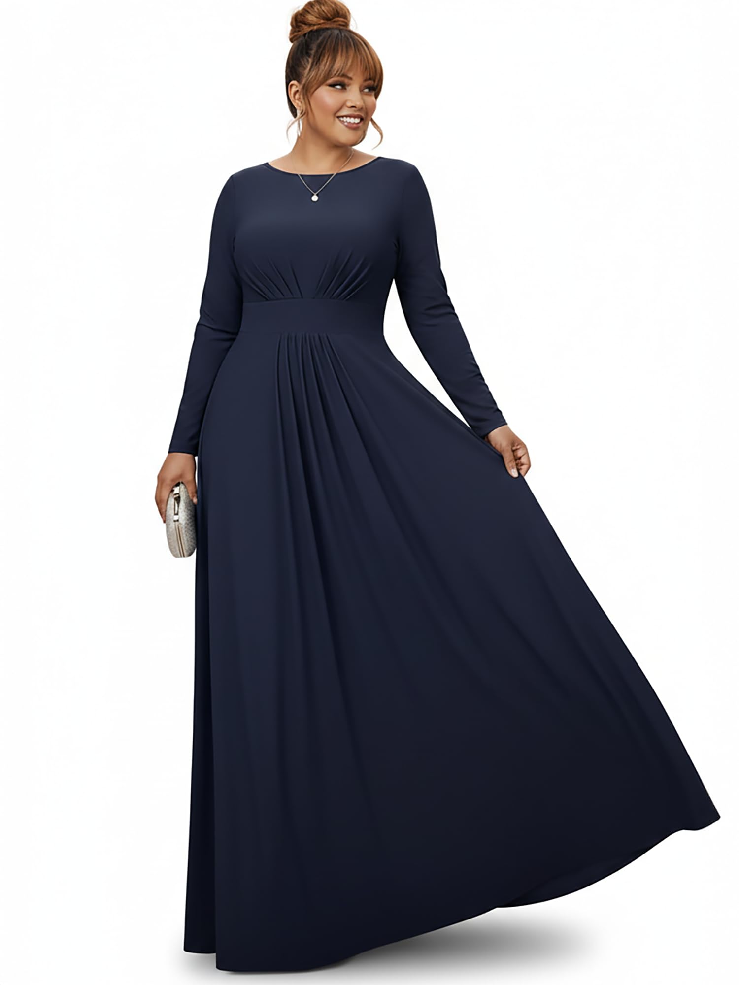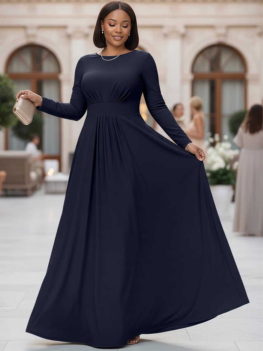 Dark Navy Blue long sleeved flattering gowns; slimming maxi dresses with sleeves; plus sized clothing for women; floor length dresses for the curvy lady; comfortable and elegant dresses for the curvaceous woman; cute full figure frocks