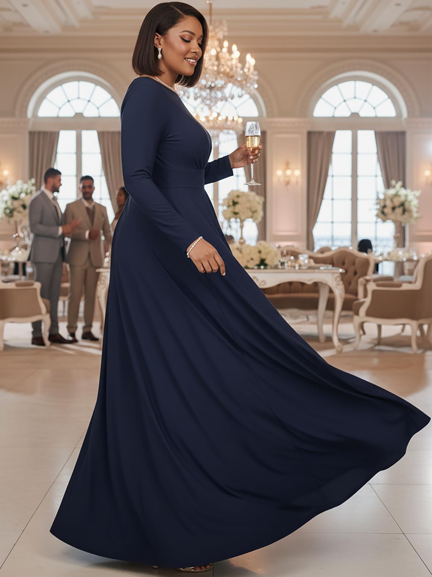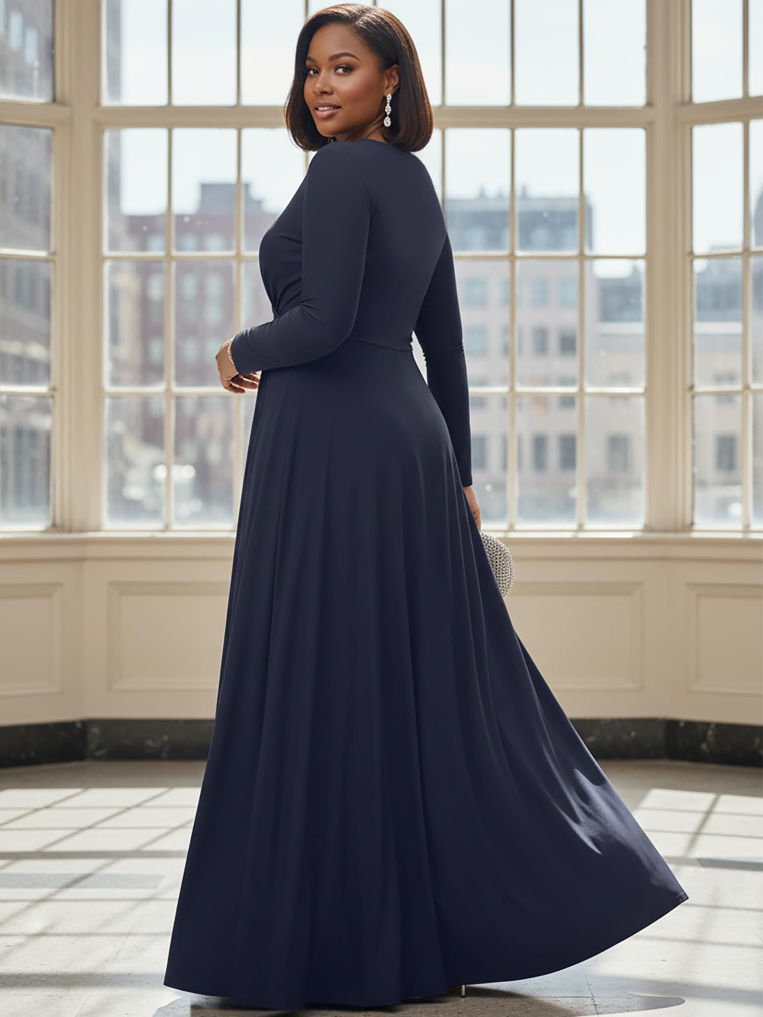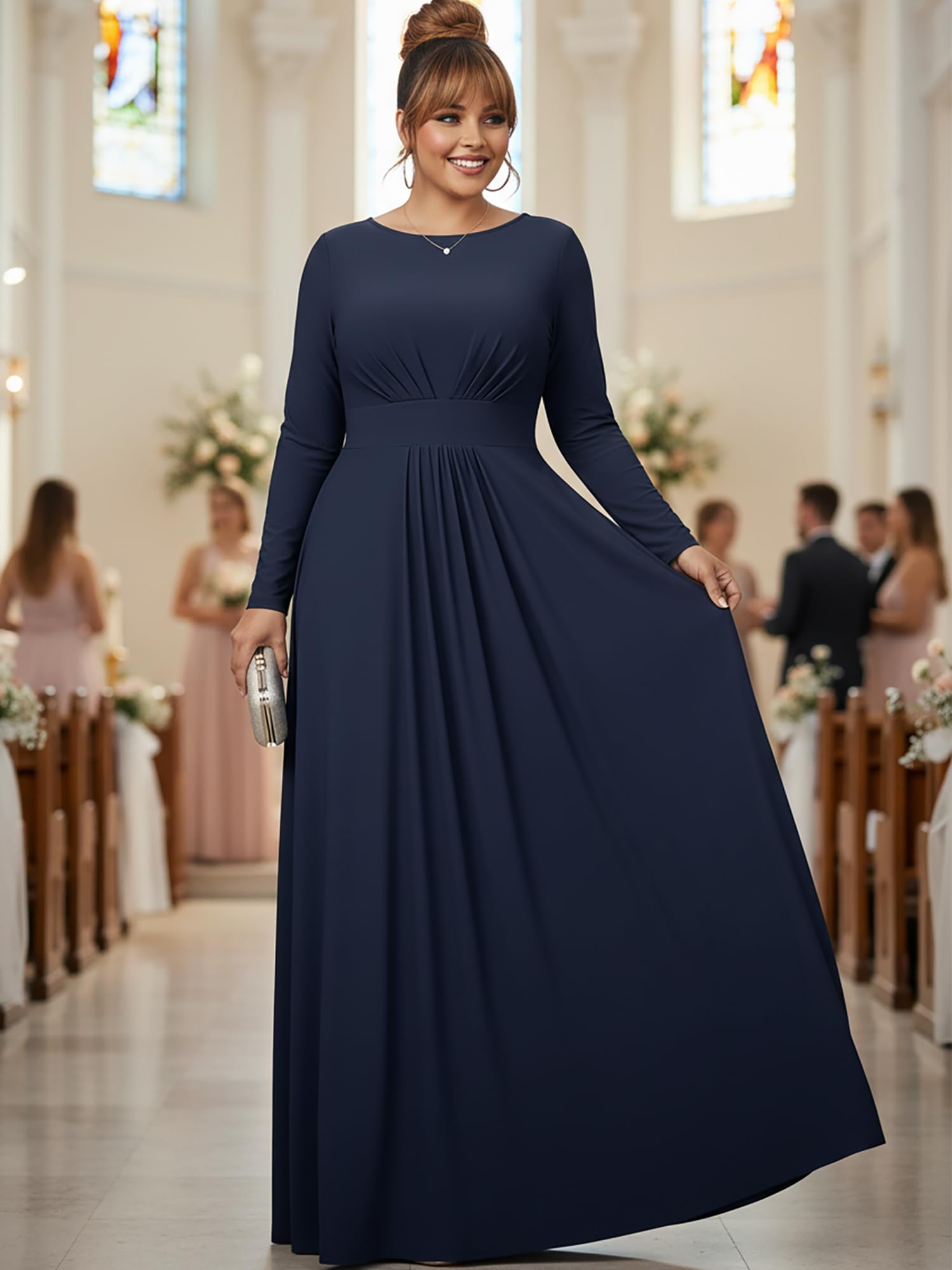 Dark Navy Blue long sleeved flattering gowns; slimming maxi dresses with sleeves; plus sized clothing for women; floor length dresses for the curvy lady; comfortable and elegant dresses for the curvaceous woman; cute full figure frocks
