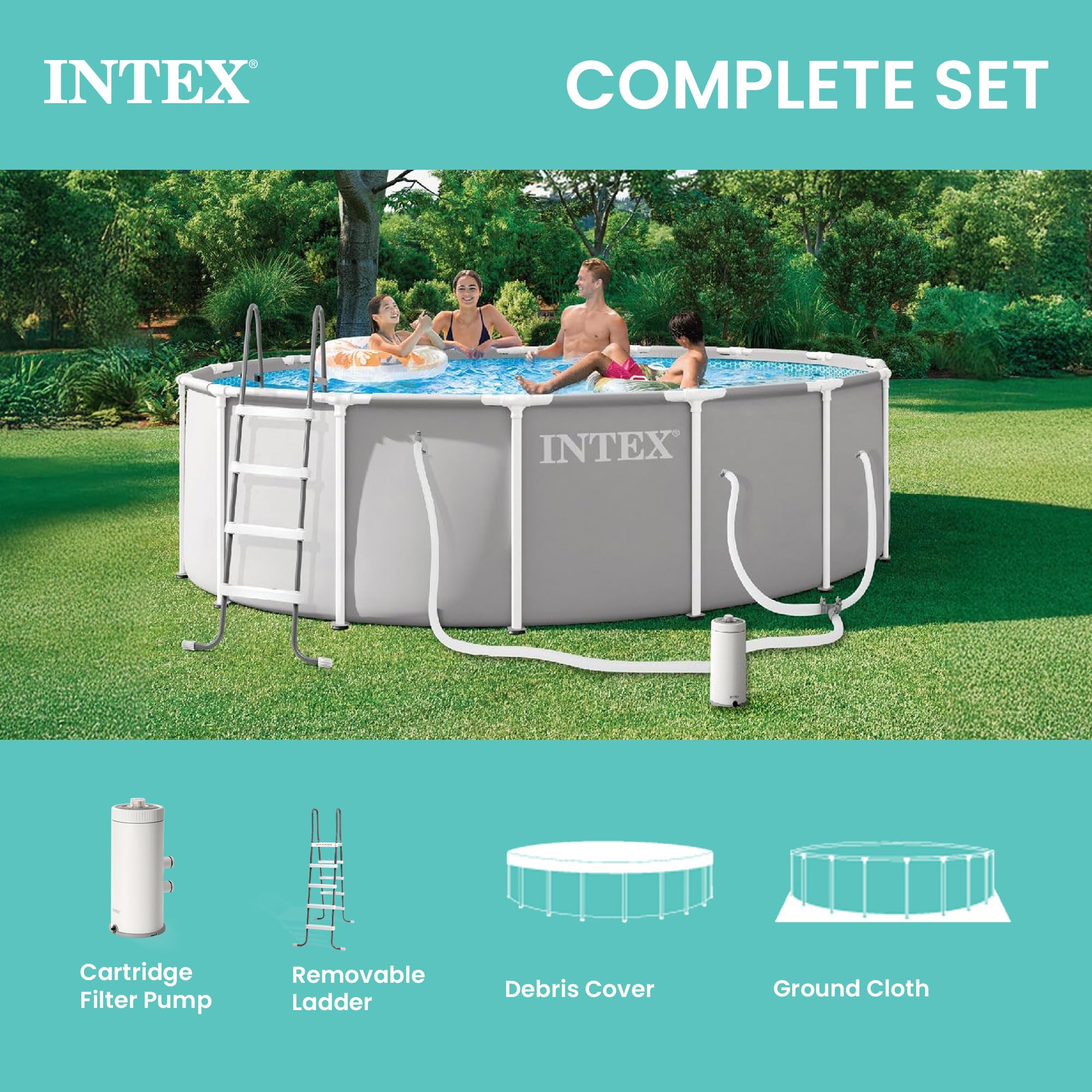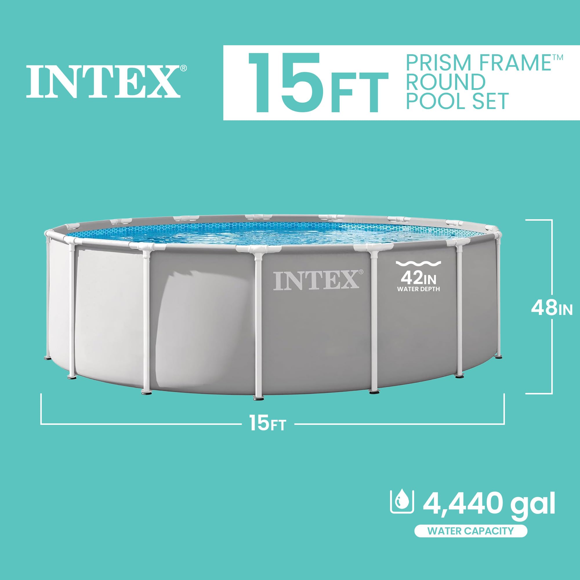 ✔ DESIGNED TO FIT ANY BACKYARD – The 26725EP Prism Frame is the pool you need for friends and family to enjoy time together this summer, with a spacious 15ft x 48in round frame design and an 4,440 gallon water capacity.