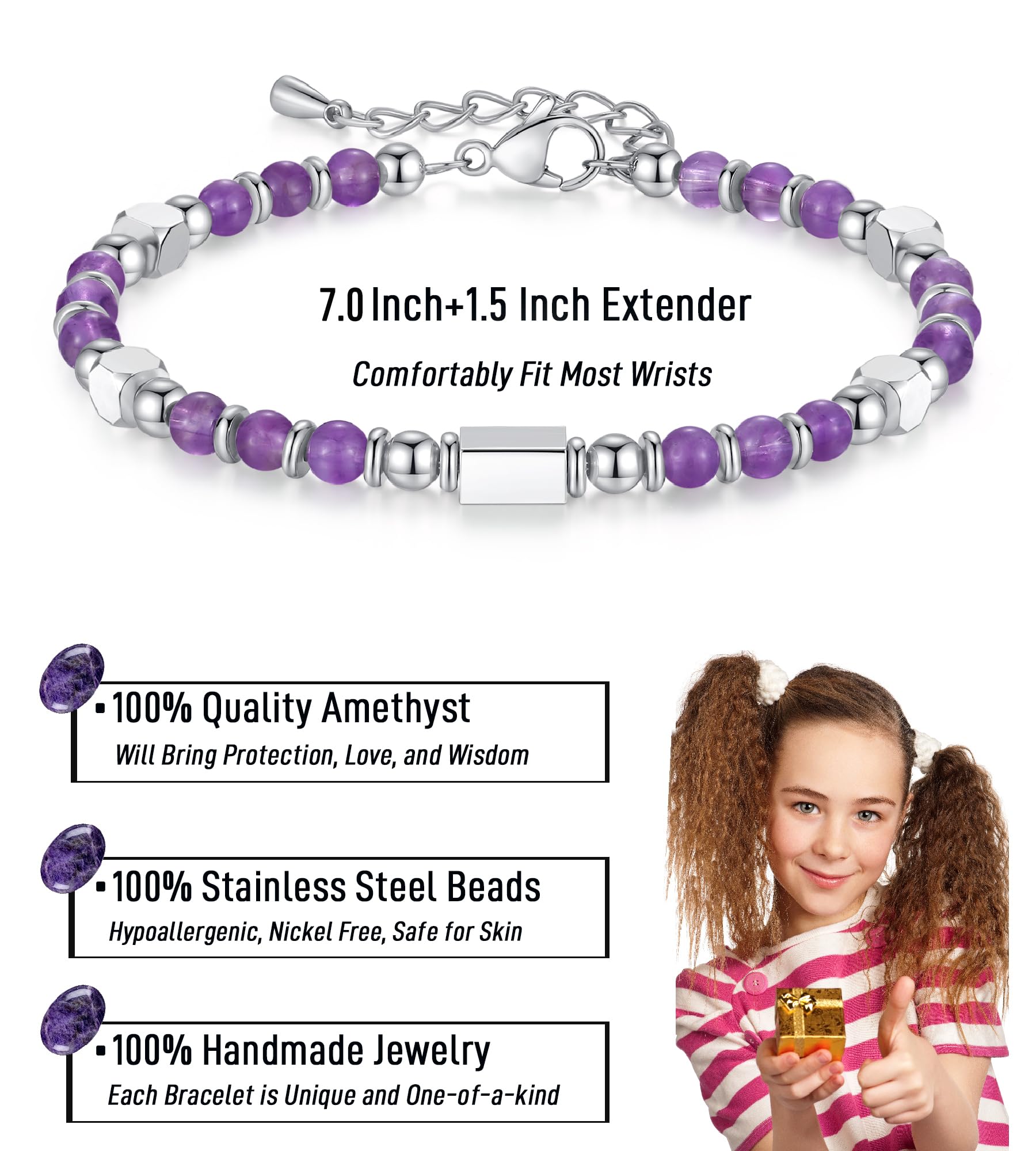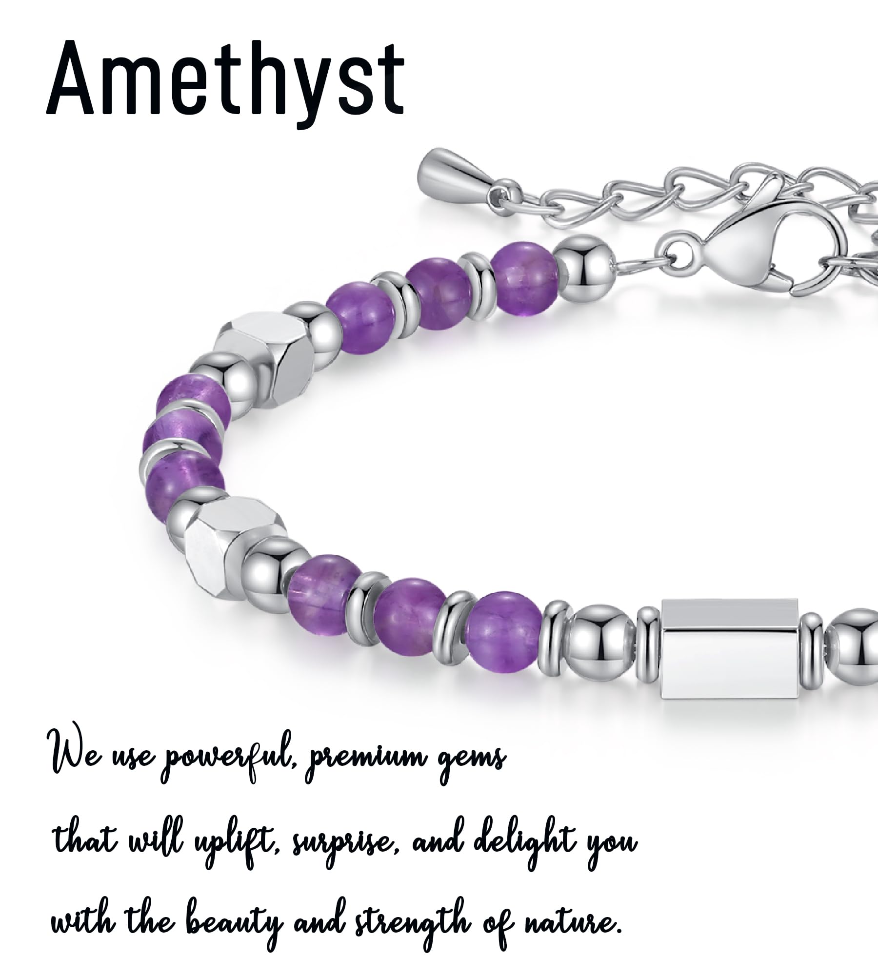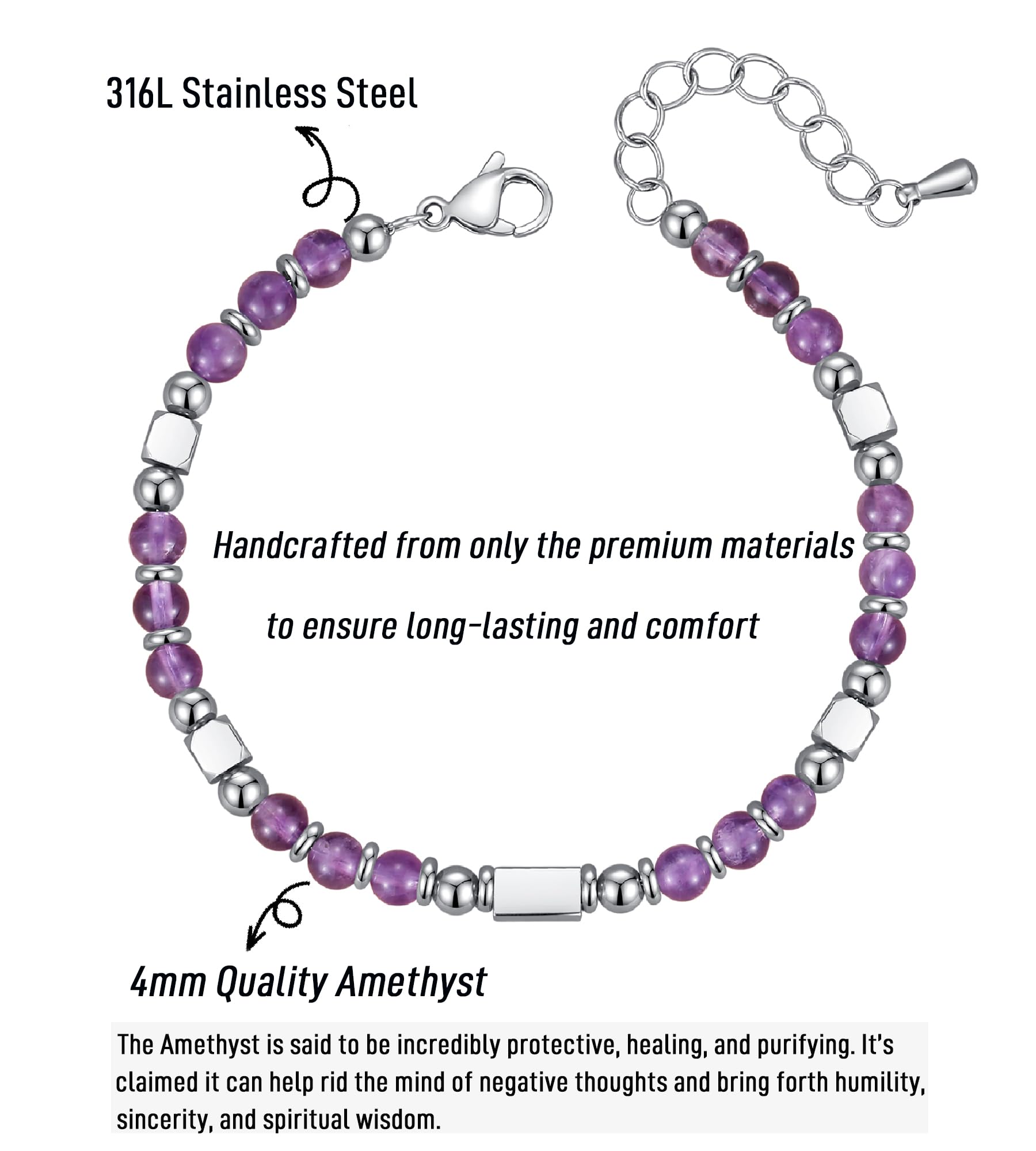 Quality: This birthday bracelet is handcrafted with 4mm quality Amethyst, 316L stainless steel beads, and 316L stainless steel charm. It is strong and 100% hypoallergenic. Every natural crystal has been carefully selected one by one and strung together to create a piece of dainty birthday jewelry. We know how important this special piece may be, and that is why we make it with premium materials that can be worn for years to come.