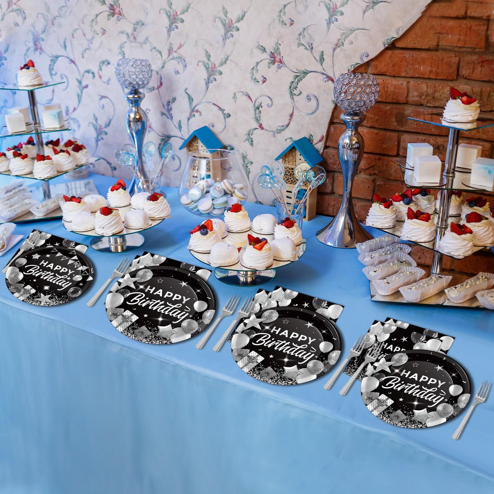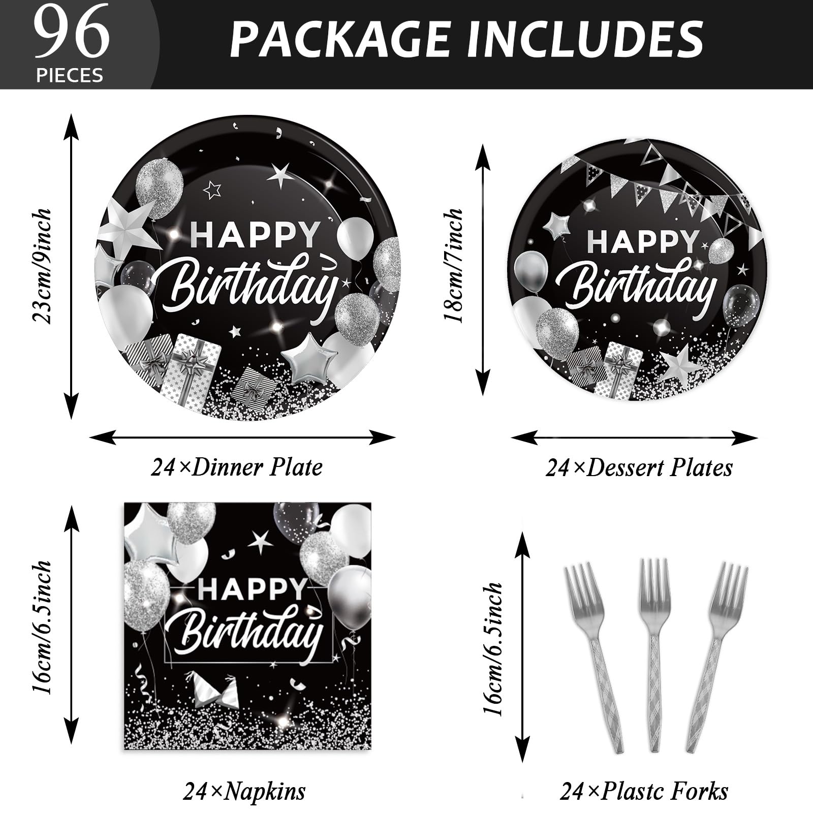 【Happy Birthday Party Supplies】You will receive 24 pieces Black and Silver happy birthday party paper dinner plates of 9’’, 24 pieces plates of 7’’, 24 pieces Black birthday napkins of 6.5’’ and 24 plastic black forks for each set that can serve 24 guests.