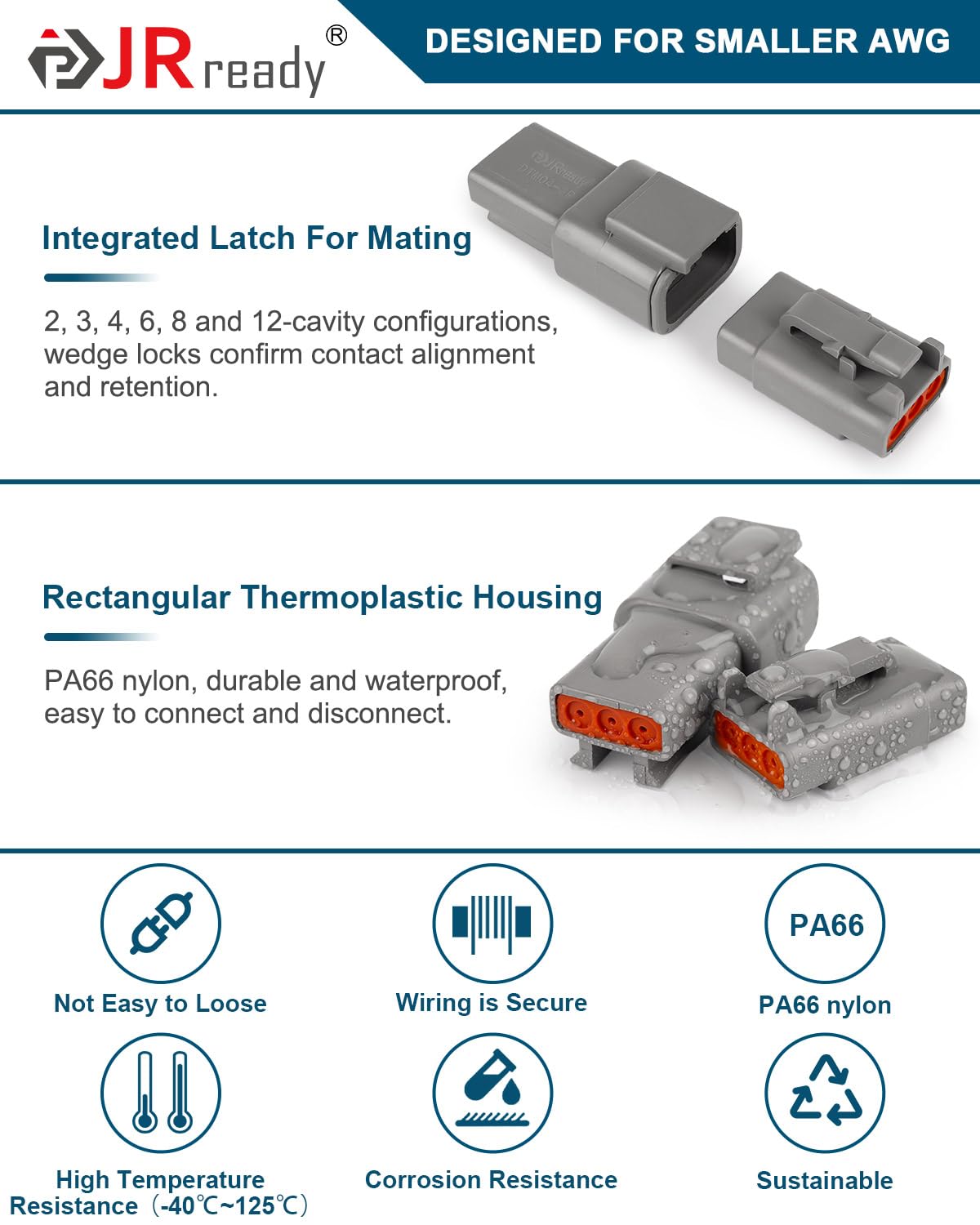 JRready DTM Connectors Material: PA66 nylon, high strength, durable and waterproof, wear resistance, corrosion resistance, good electrical insulation, convenient to connect and disconnect, suitable for long time use.
