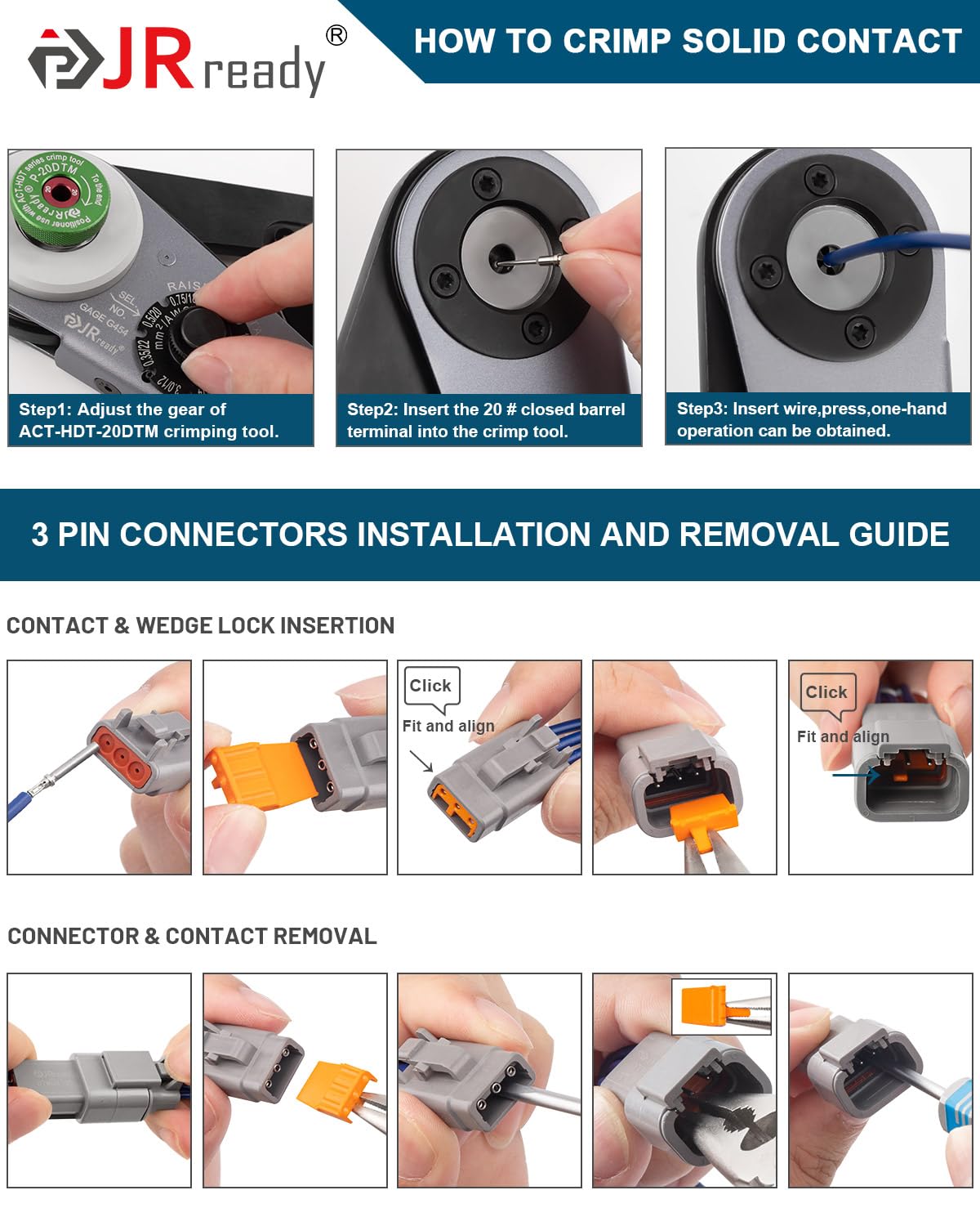 JRready Deutsch DTM Connector Package List: 4 pairs DTM 3 pin connectors, 12 pairs size 20 solid contacts(12 pcs pins, 12 pcs sockets), 4 pcs wedgelocks for plugs, 4 pcs wedgelocks for receptacles, 4 pcs seal plugs.