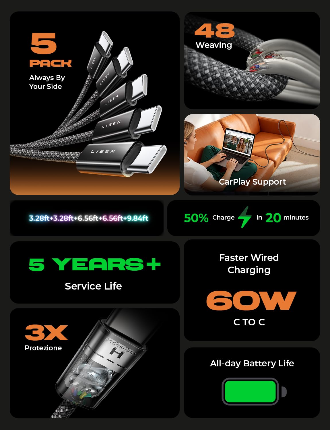 【What You Get】LISEN USB C to USB C Cable 5-Pack (10FT), 24-Month worry-free period and 24/7 customer service, if you have any questions, we will resolve your issue within 24 hours. Whether you're shopping for galaxy or iphone 16 pro max charger cord accessories gifts for men/women or reliable car accessories, this super fast charger usb c to c cable is built to last