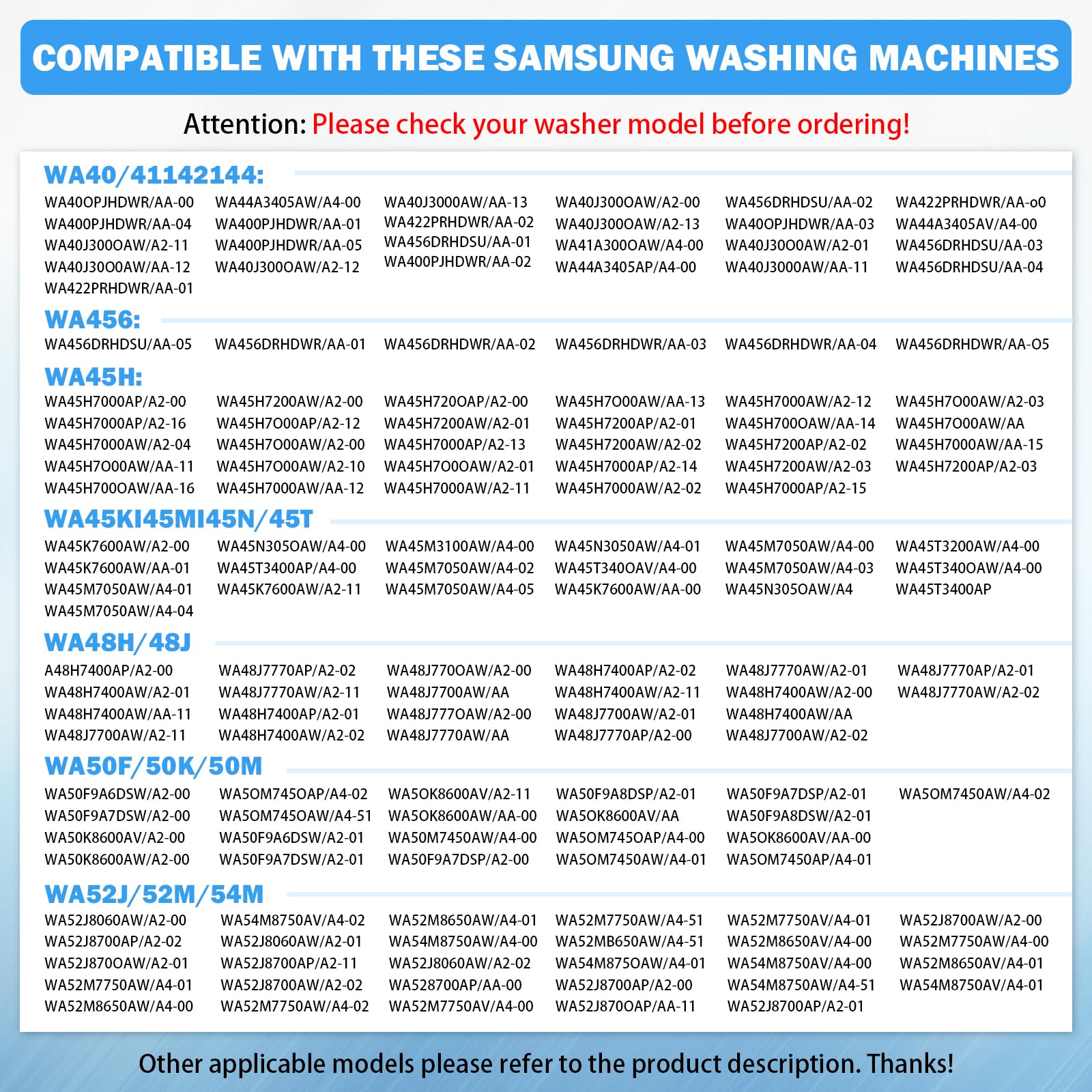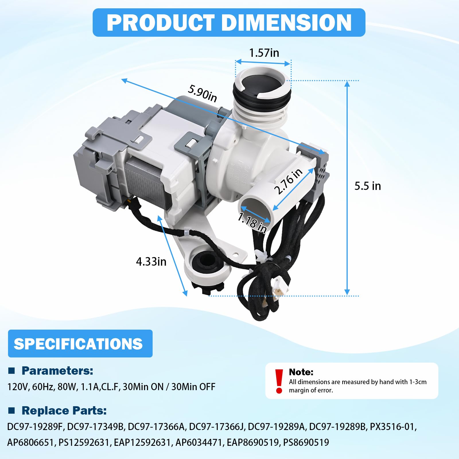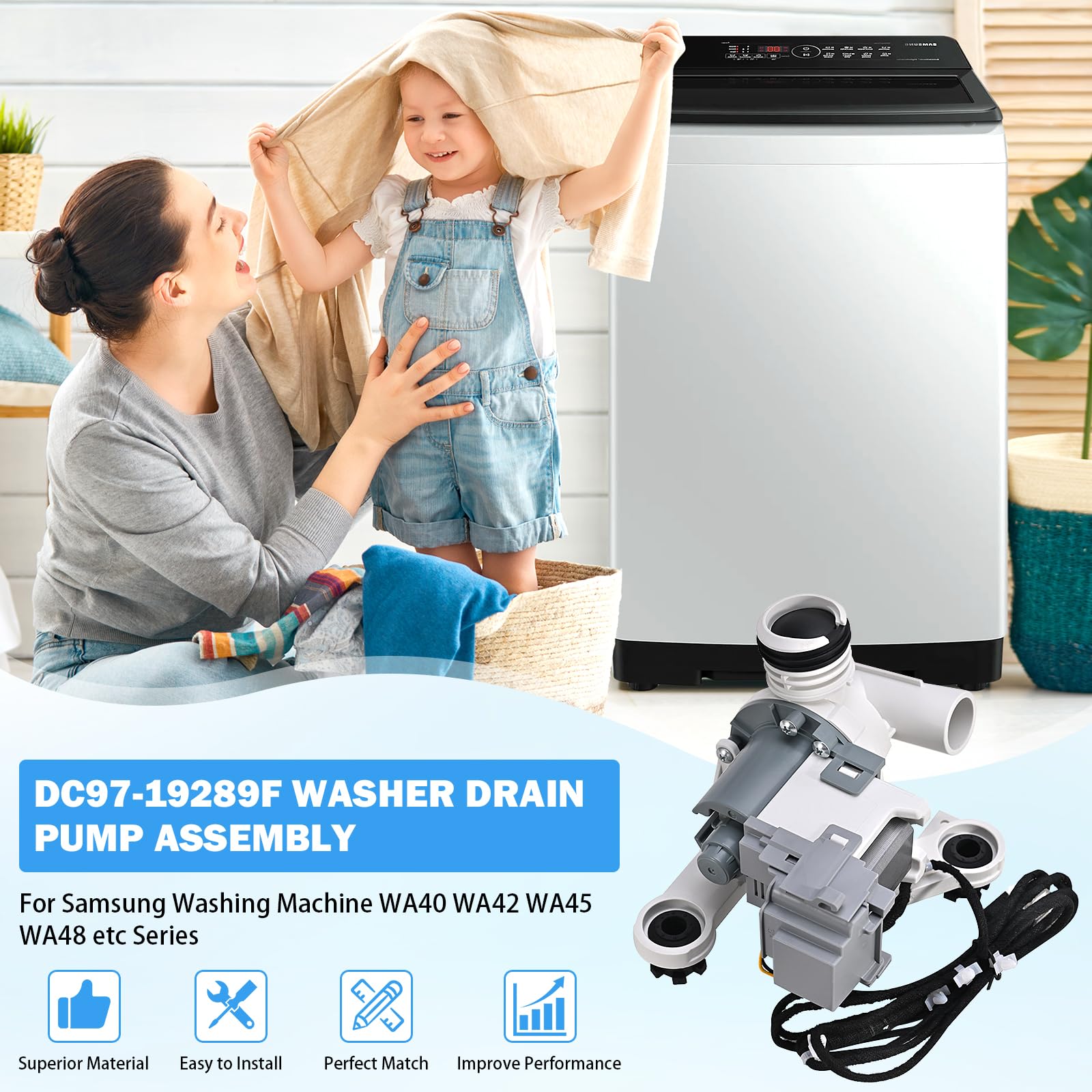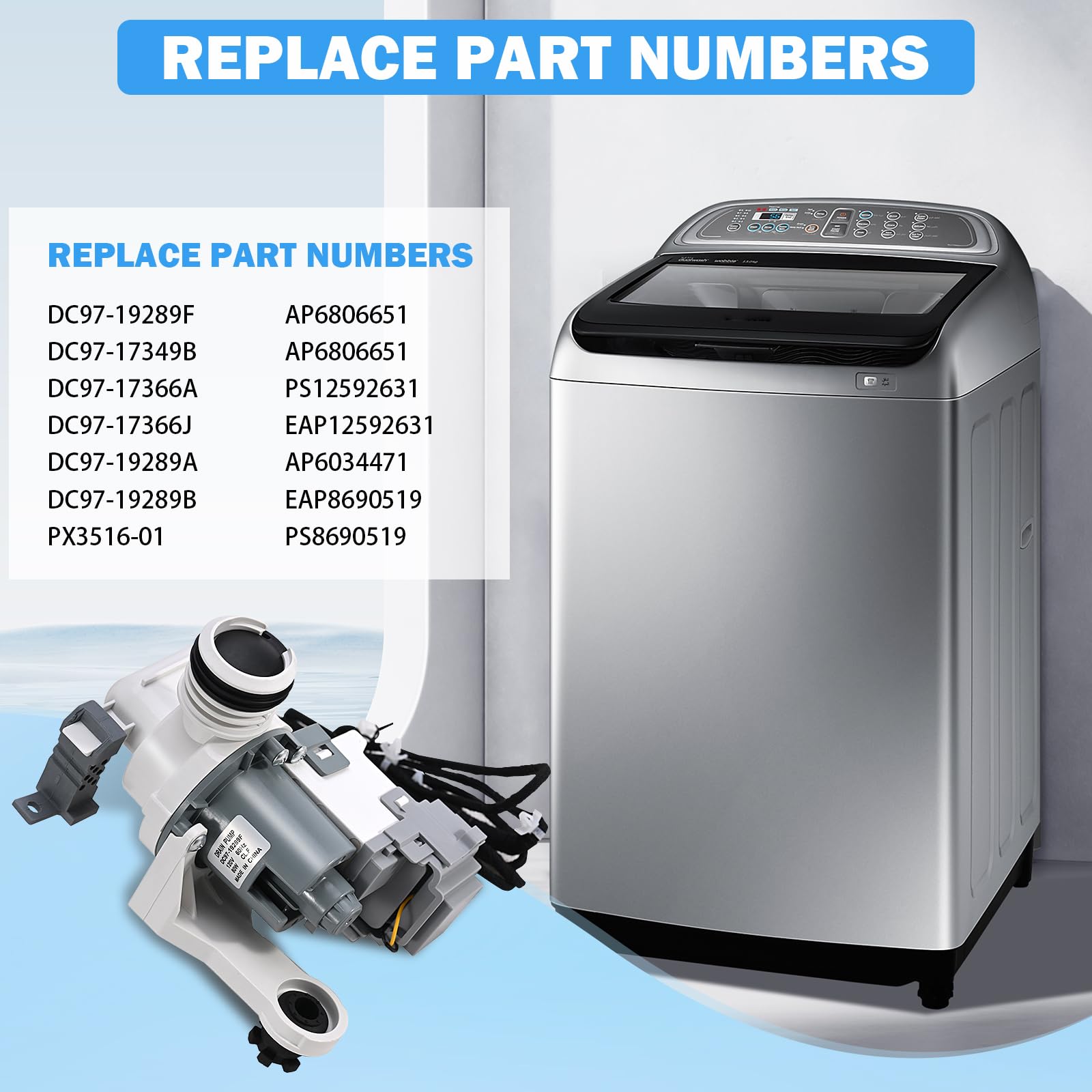 [EXACT FIT & WIDE COMPATIBILITY] Professional-grade DC97-19289F washer drain pump. Perfectly replaces part numbers: DC97-17349B, DC97-17366A, DC97-17366J, DC97-19289A, DC97-19289B, PX3516-01, AP6806651, PS12592631, EAP12592631. Designed specifically for Samsung WA series including WA40, WA45, WA48, WA50, WA52, and WA54 models. Please verify your model number before ordering to ensure a seamless match.