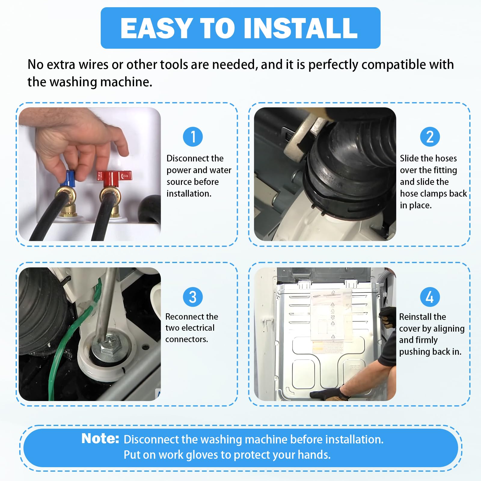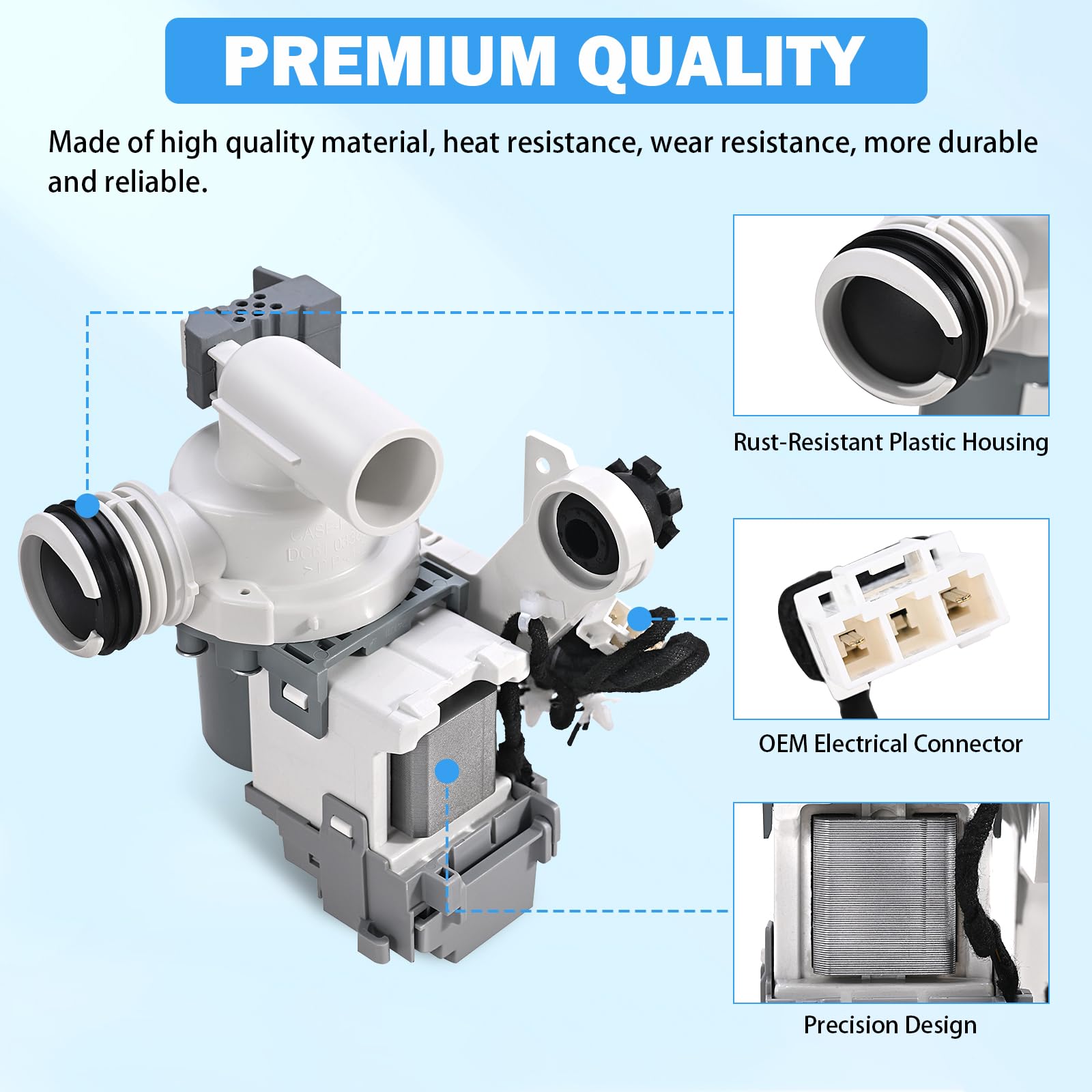 [DURABLE CONSTRUCTION & EASY DIY] Crafted from premium reinforced plastic and high-torque motor components, this pump meets or exceeds OEM standards. The plug-and-play design allows for a straightforward DIY installation—save hundreds of dollars on professional repair fees. Get your laundry routine back on track in less than 30 minutes with basic tools.