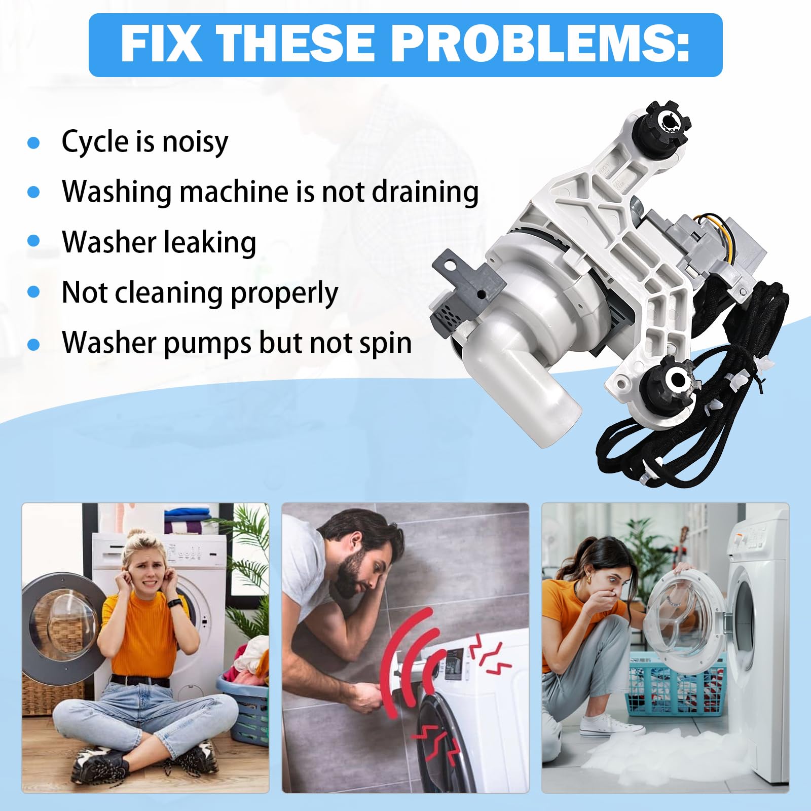 [FIX COMMON WASHER ISSUES] Is your washer not draining, leaking from the bottom, or making unusual loud noises during the spin cycle? Our drain pump motor is the ultimate solution. It effectively clears water out of the tub, restoring your appliance's performance and preventing water damage to your laundry room.