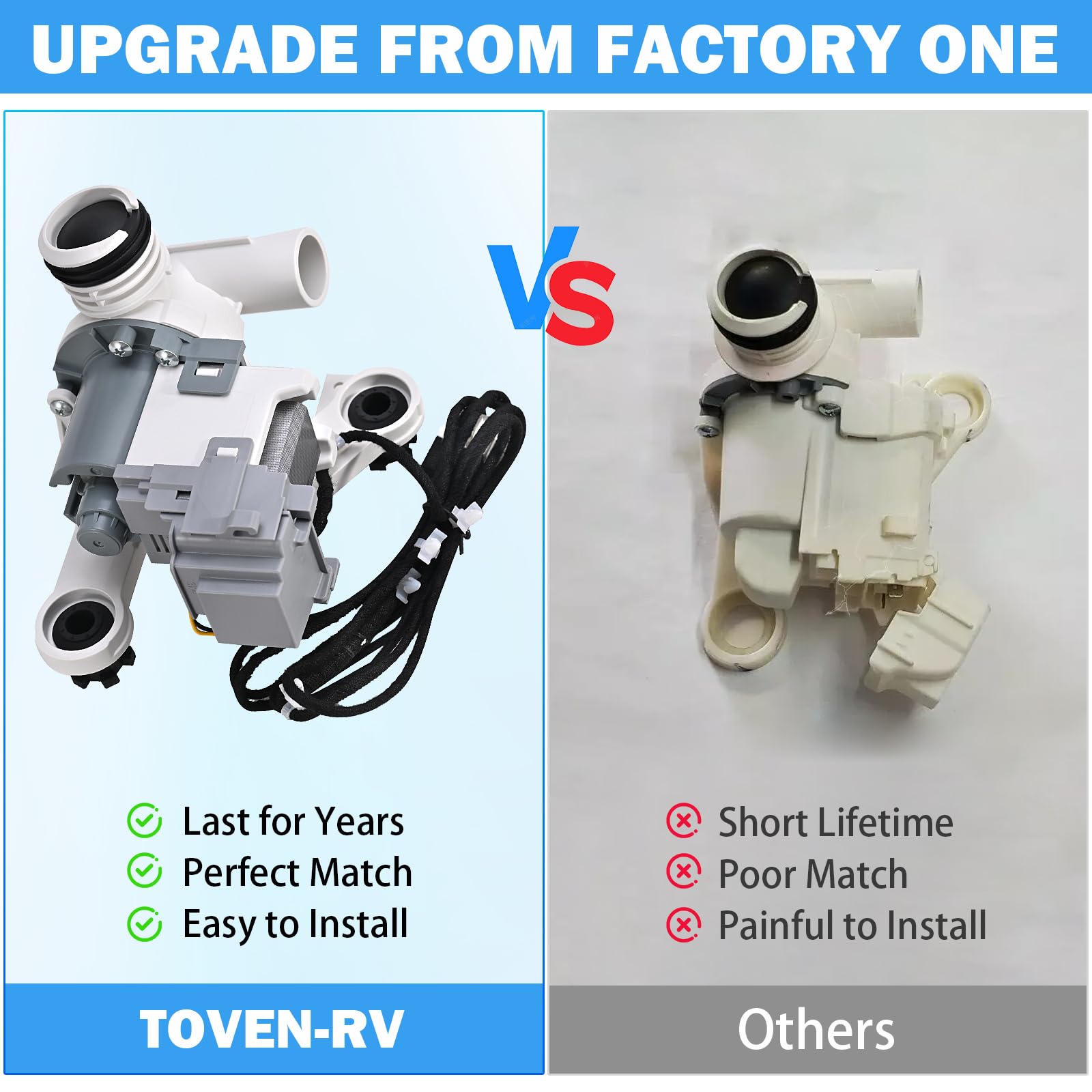 [1-YEAR WARRANTY & RELIABLE SUPPORT] At TOVEN-RV, we prioritize quality and customer satisfaction. Each DC97-19289F drain pump undergoes rigorous factory testing to ensure long-term reliability. We provide a comprehensive 1-Year Warranty for peace of mind. If you have any questions regarding compatibility or installation, our expert support team is ready to assist you.