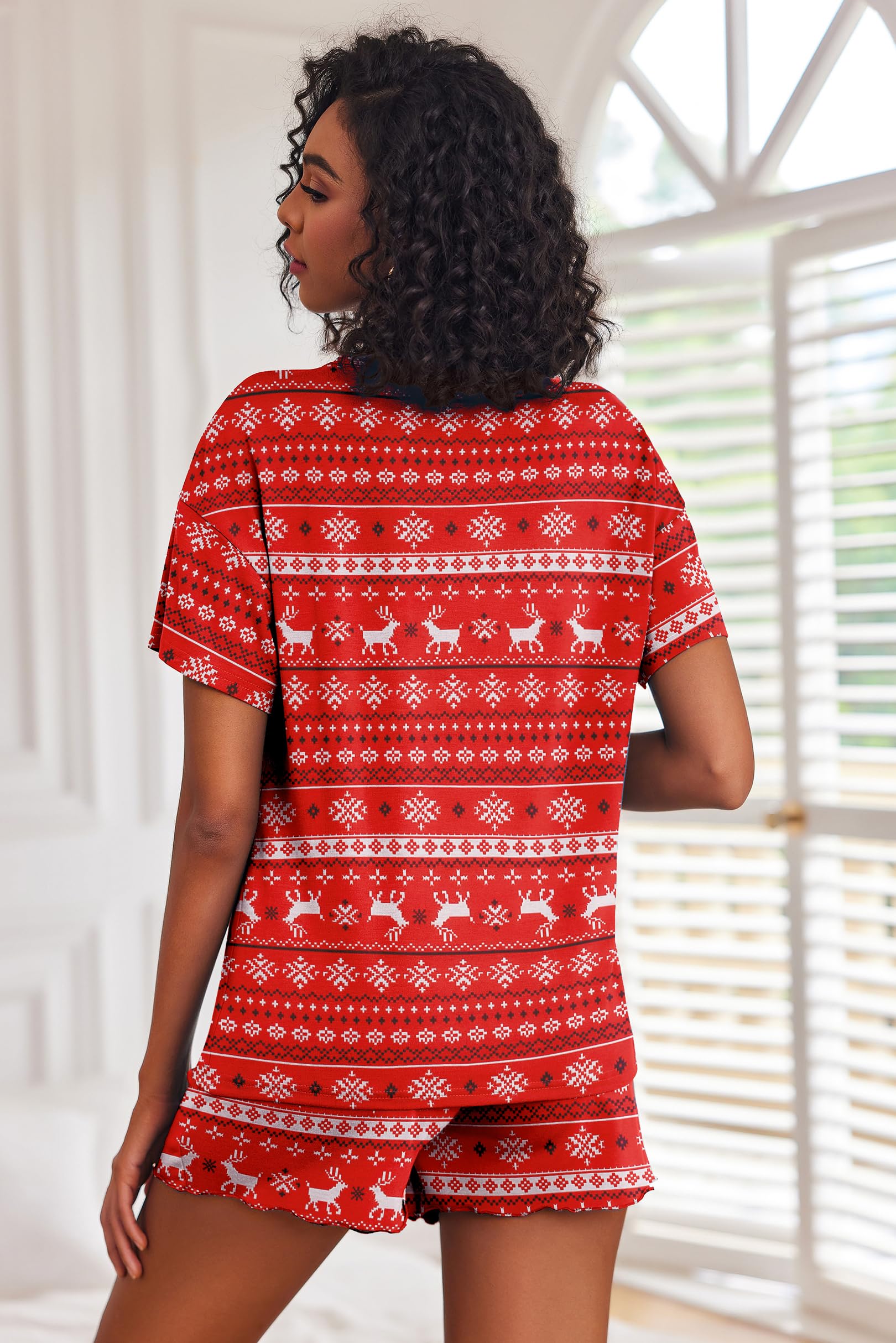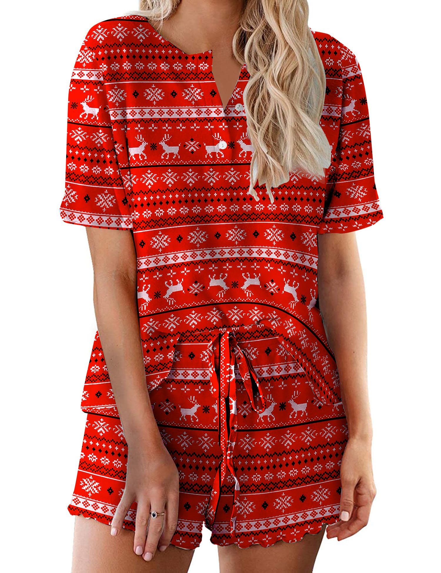 [Pajamas Features]: Henley neckline with button, short sleeve pajamas tops with ruffled pajamas shorts. Drawstring elastic waist, can be adjustabled depend on your need. This 2 piece pj sets nightwear sleepwear is perfect for women, juniors, ladies and teens