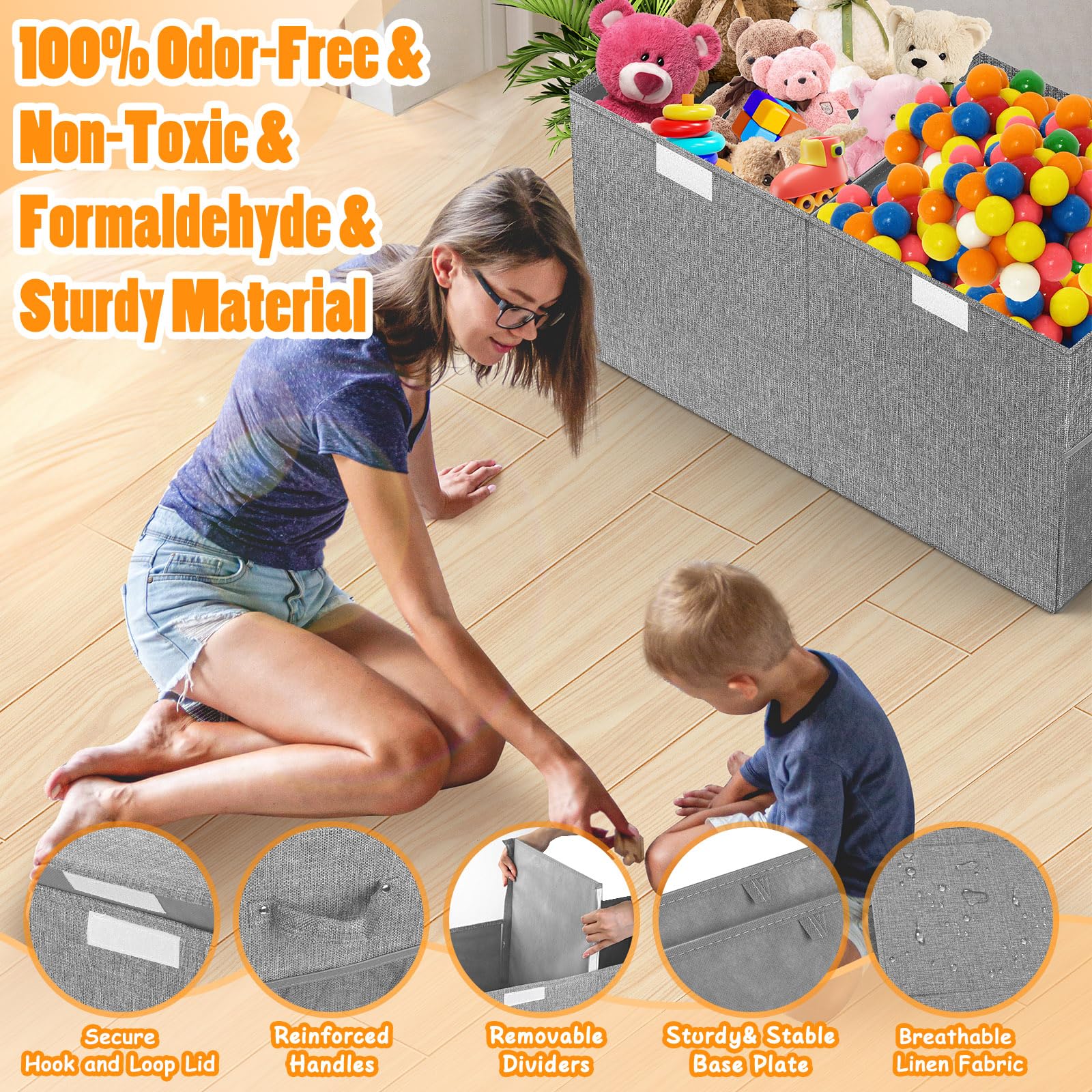 DUSTPROOF AND COLLAPSIBLE. Toy bin’s lid closes with hook and loop tape front and back. It protects against dust, covers items to hide toys and make room neater. The lid can also be used as a flip top or removed. Foldable toy organizer box is easy to assemble. Simply open the package, place the longer thicken board on the bottom, then install the divider to get started. When not using it, you can fold the toy chest completely.