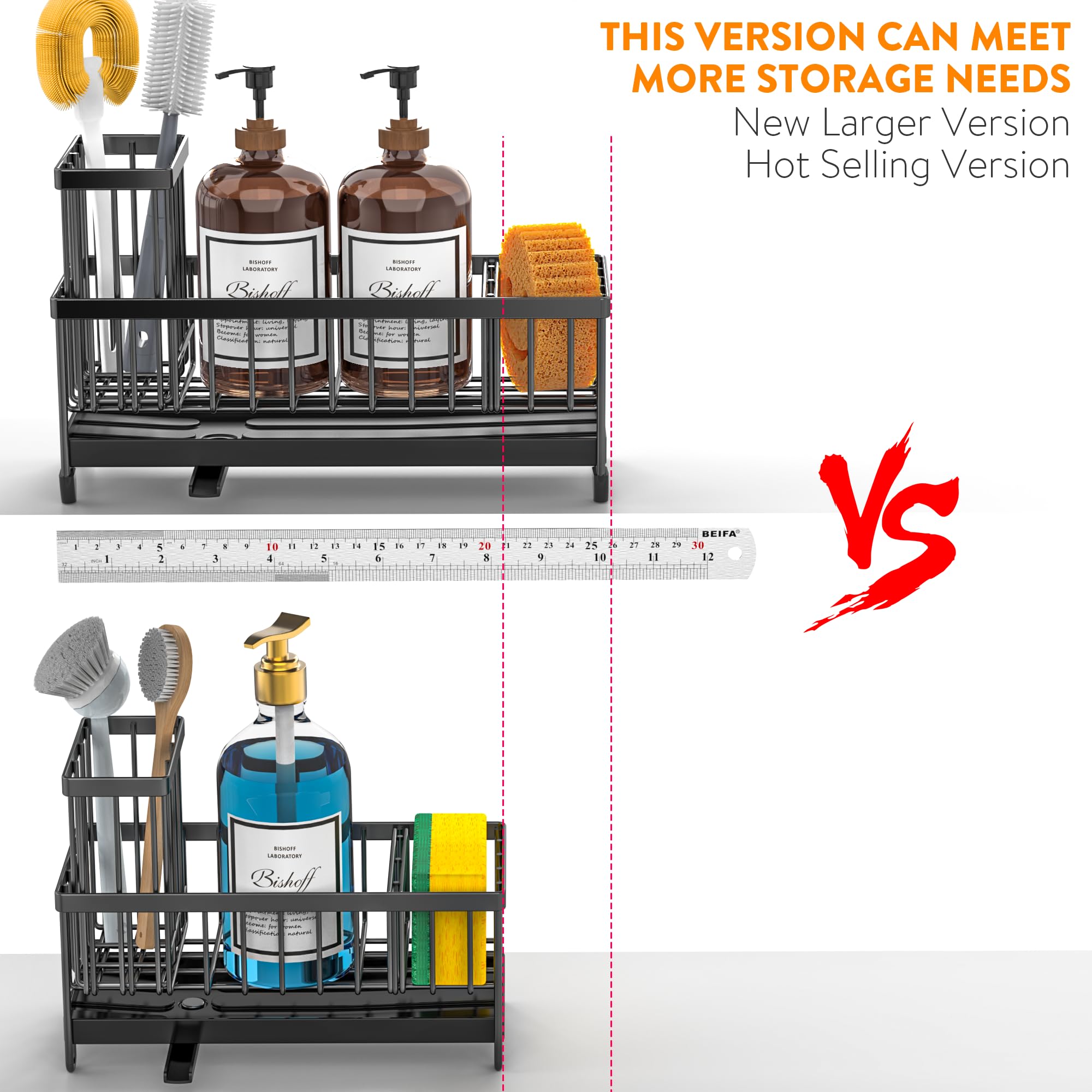 【LARGER CAPACITY】Cisily kitchen sink organizer is longer in length: 10.62 inch. So this sink caddy provides larger storage space and hold more cleaning accessories: dish soap dispenser x1, hand soap dispenser x1, sponge x1, some brushes.