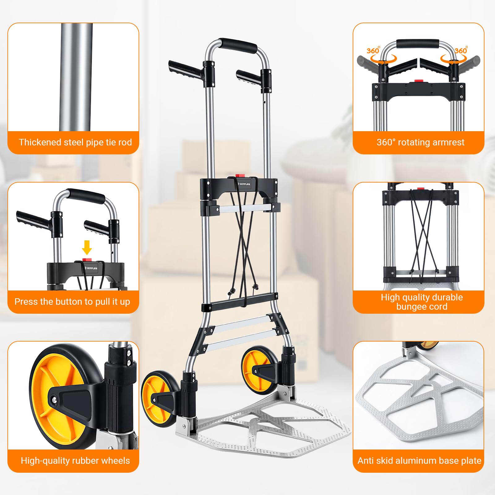 Heavy Duty Load Capacity for Effortless Moving: Gorpuire folding hand truck is made from high-strength steel tubes and a durable aluminum alloy base, with a maximum weight capacity of 380 lbs. Whether you're moving heavy furniture, appliances, or large boxes, it can easily handle the job. Its strong and durable construction ensures safe use in various environments such as at home, in the office, or in a warehouse, making it the perfect moving assistant for all your heavy lifting tasks