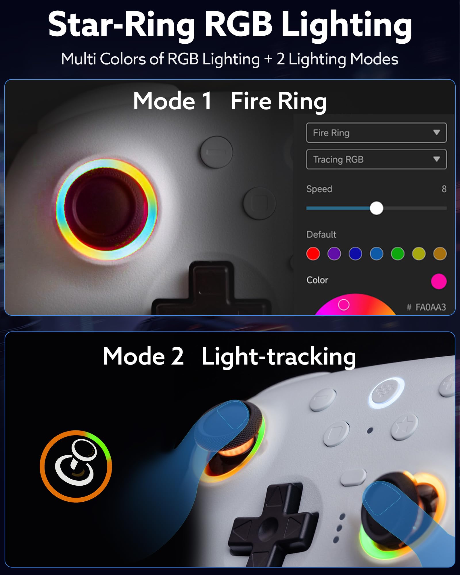 TMR Joysticks with RGB Fire Ring – Features high-sensitivity TMR joysticks for improved precision and durability, plus wear-resistant joystick rings and customizable RGB lighting for an immersive experience.