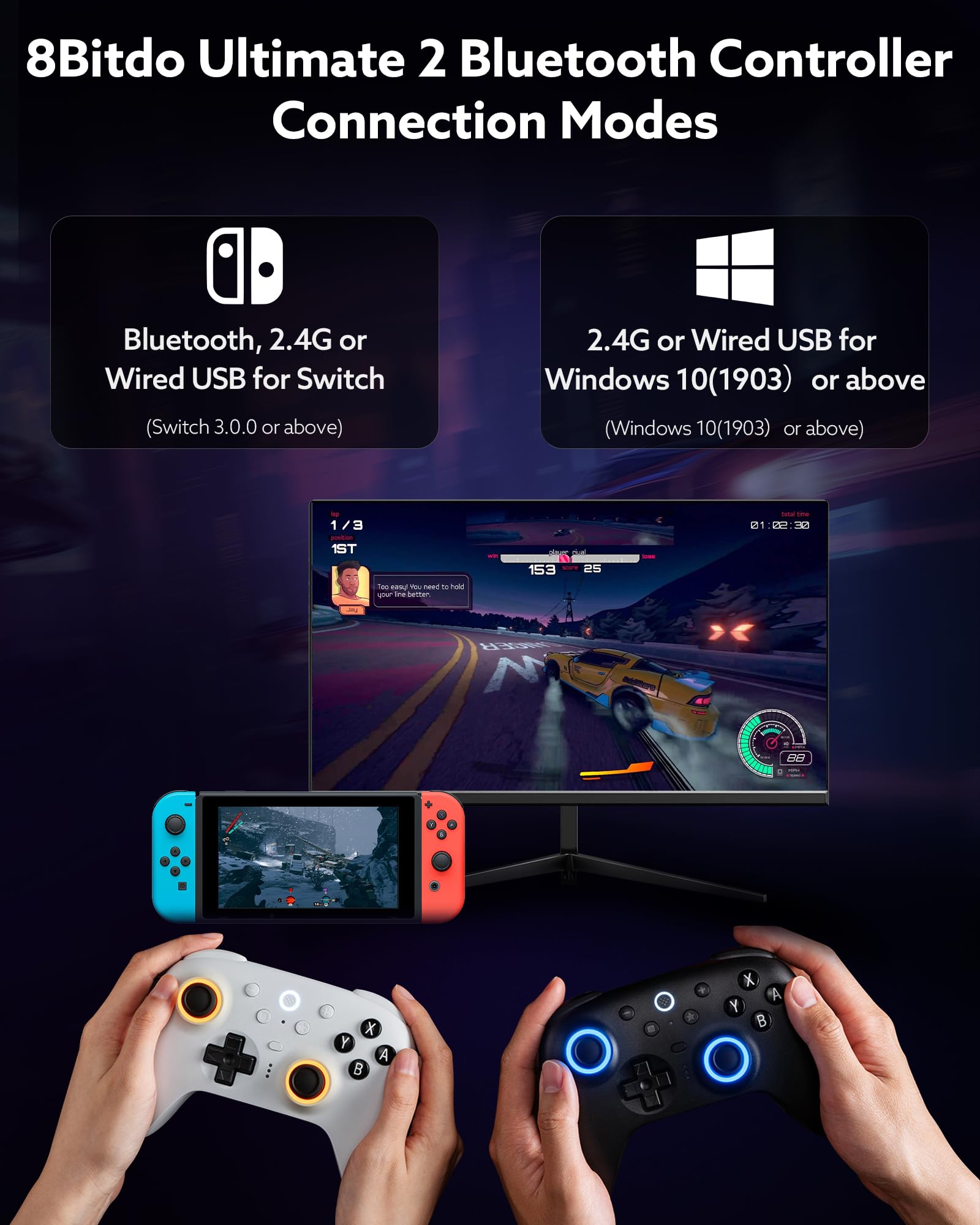 Flagship Performance, Fully Upgraded – The 8Bitdo Ultimate 2 Bluetooth Controller compatible with Switch (via Bluetooth, 2.4G, or Wired USB) and Windows (via 2.4G or Wired USB).