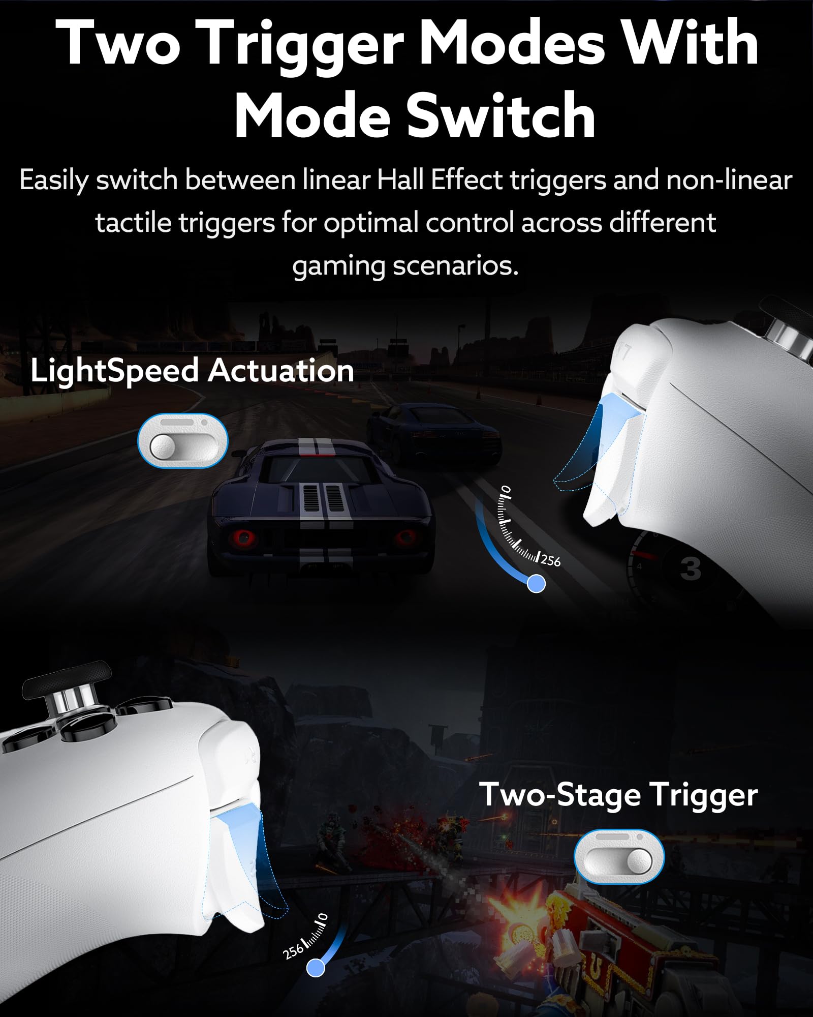Trigger Mode Switch – Instantly toggle between linear Hall Effect triggers and tactile triggers to match your gameplay style and improve control across various game genres.