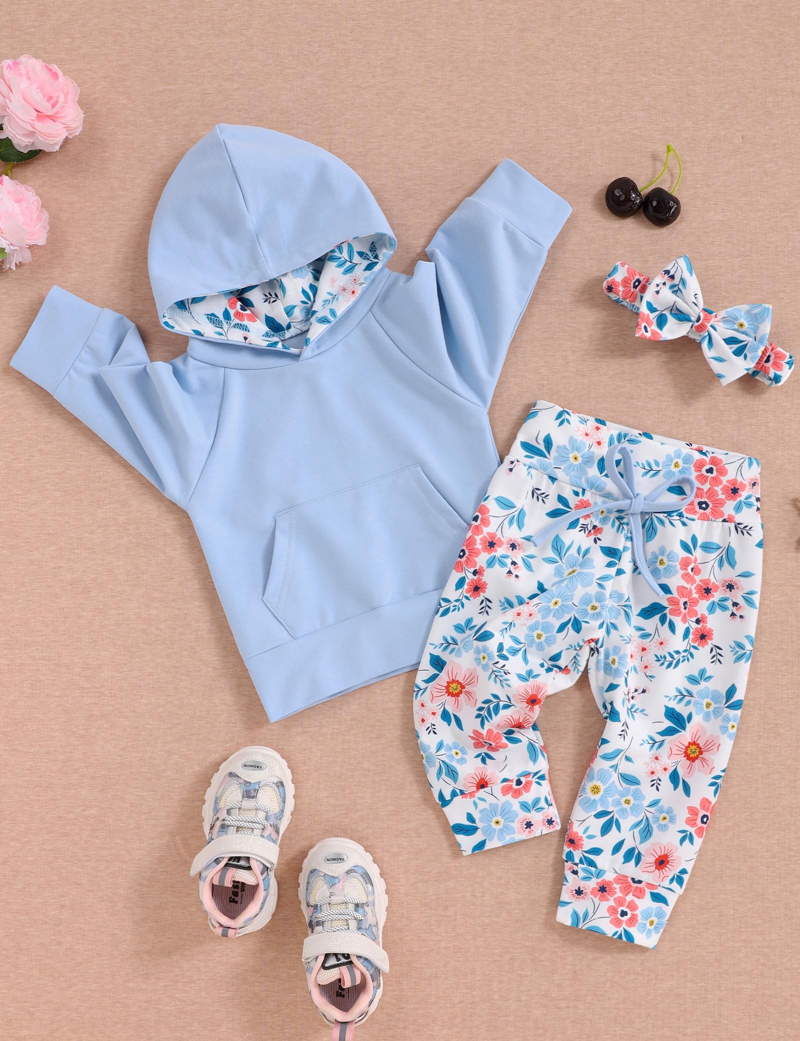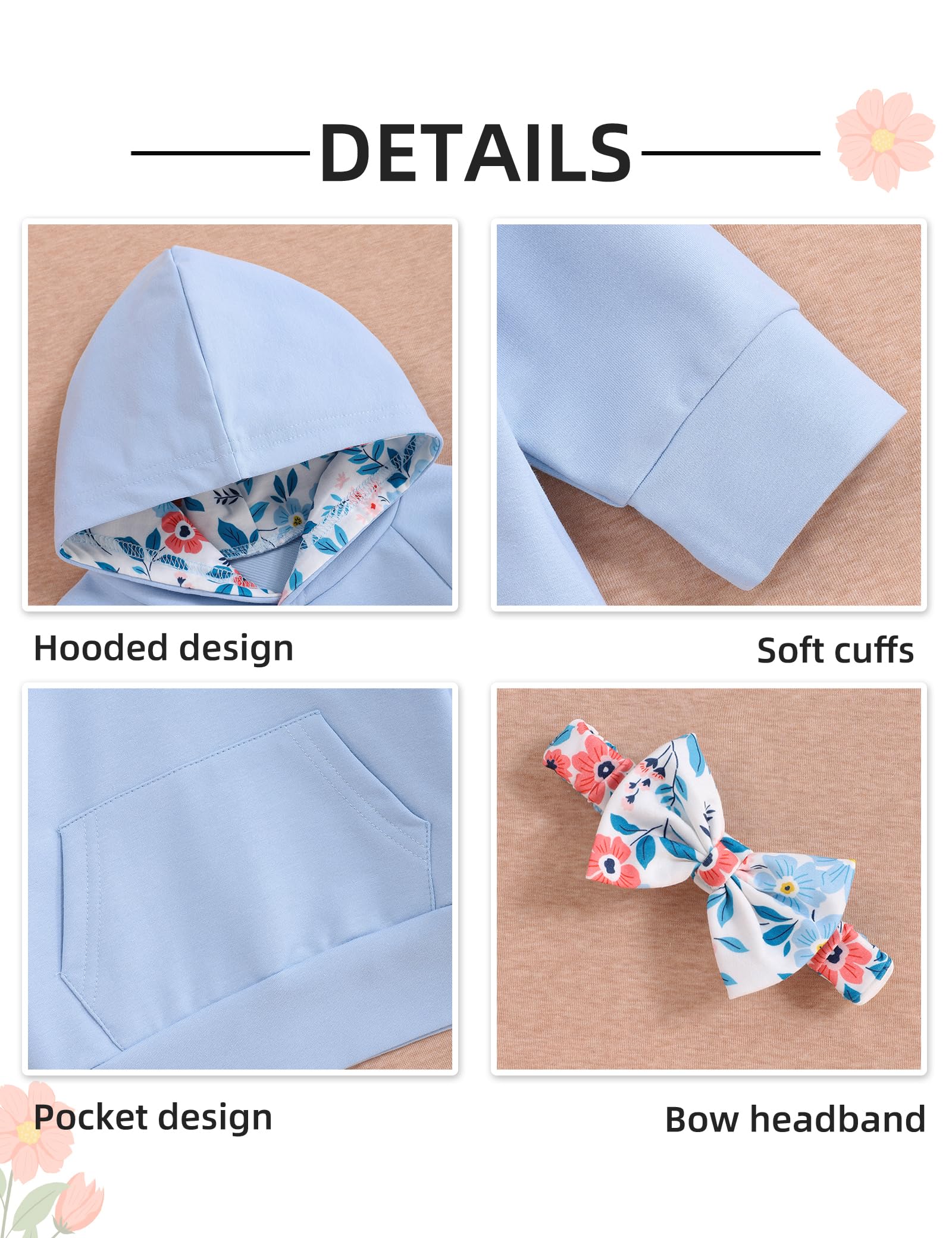 Floral pattern hoodie with kangaroo pocket design, variety of colors and prints,elastic waistband pants. Cute toddler floral outfit set will makes your baby girls more lovely