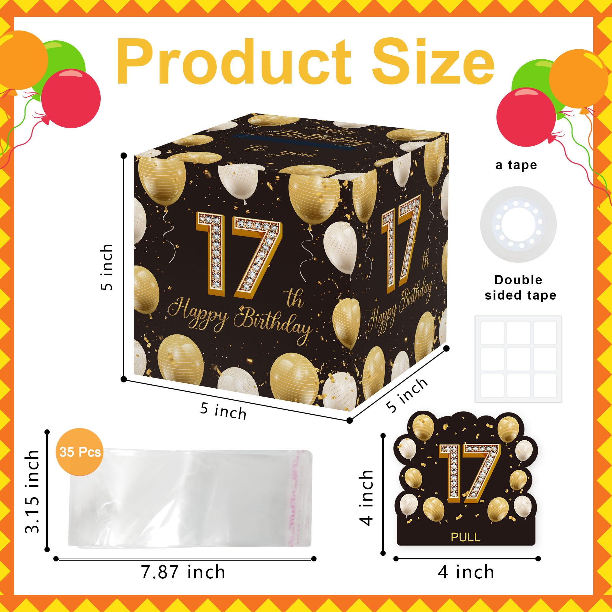 Surprise Gift Box: this gift box measures 5x5 inches, is made of durable cardboard. It also includes 2 theme-related shaped card(with adhere glue dots), 1 roll of transparent tape and 35 plastic pouches similar to the size of U.S. currency for easy placement of bills.