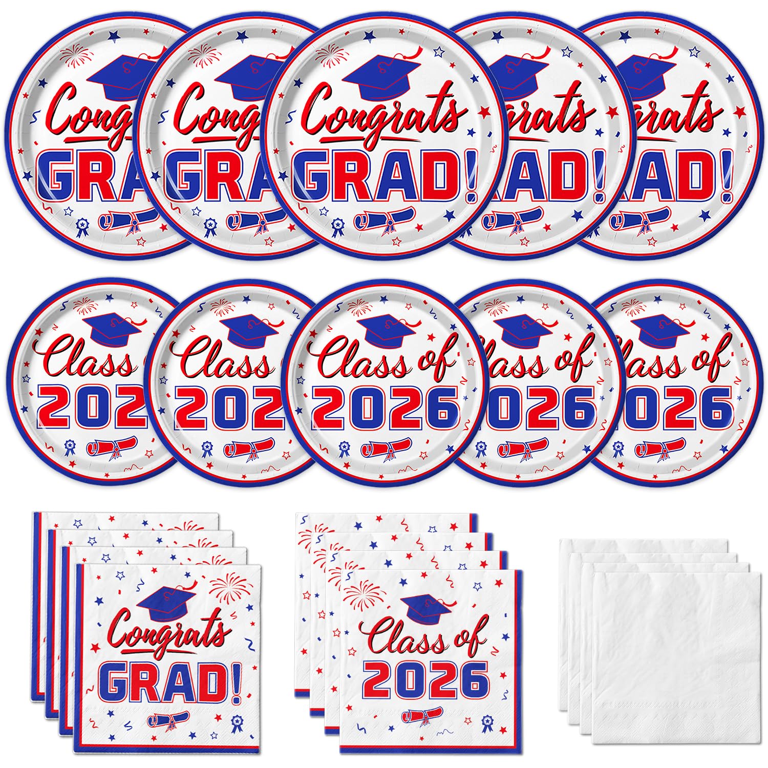 2026 graduation cap cupcake toppers: 8 pcs blue grad cap cupcake toppers with red tassel, 8 pcs red 2026 number cupcake toppers, 8 pcs red and blue diploma bow cupcake toppers