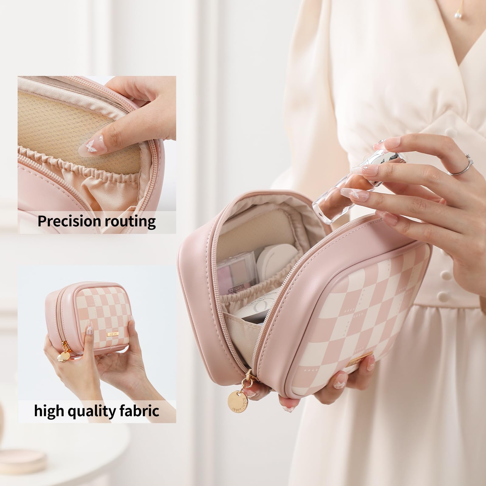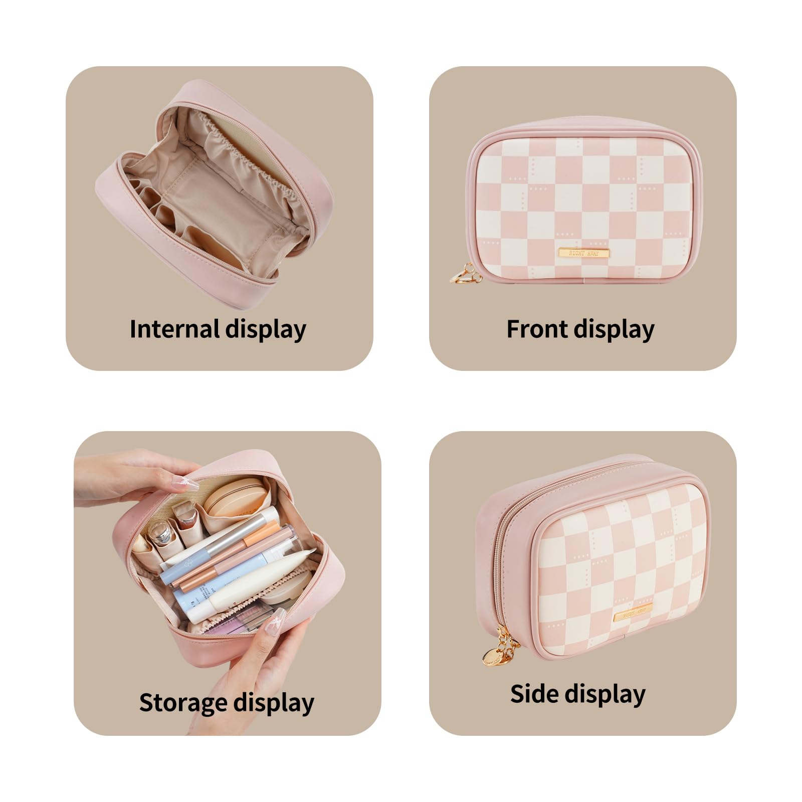 Stylish Design:The square-shaped make up bag features a trendy checkerboard pattern for a chic, minimalist look. Its flat bottom allows it to stand upright for easy access, while raised edges prevent items from slipping out—combining fashion with practicality