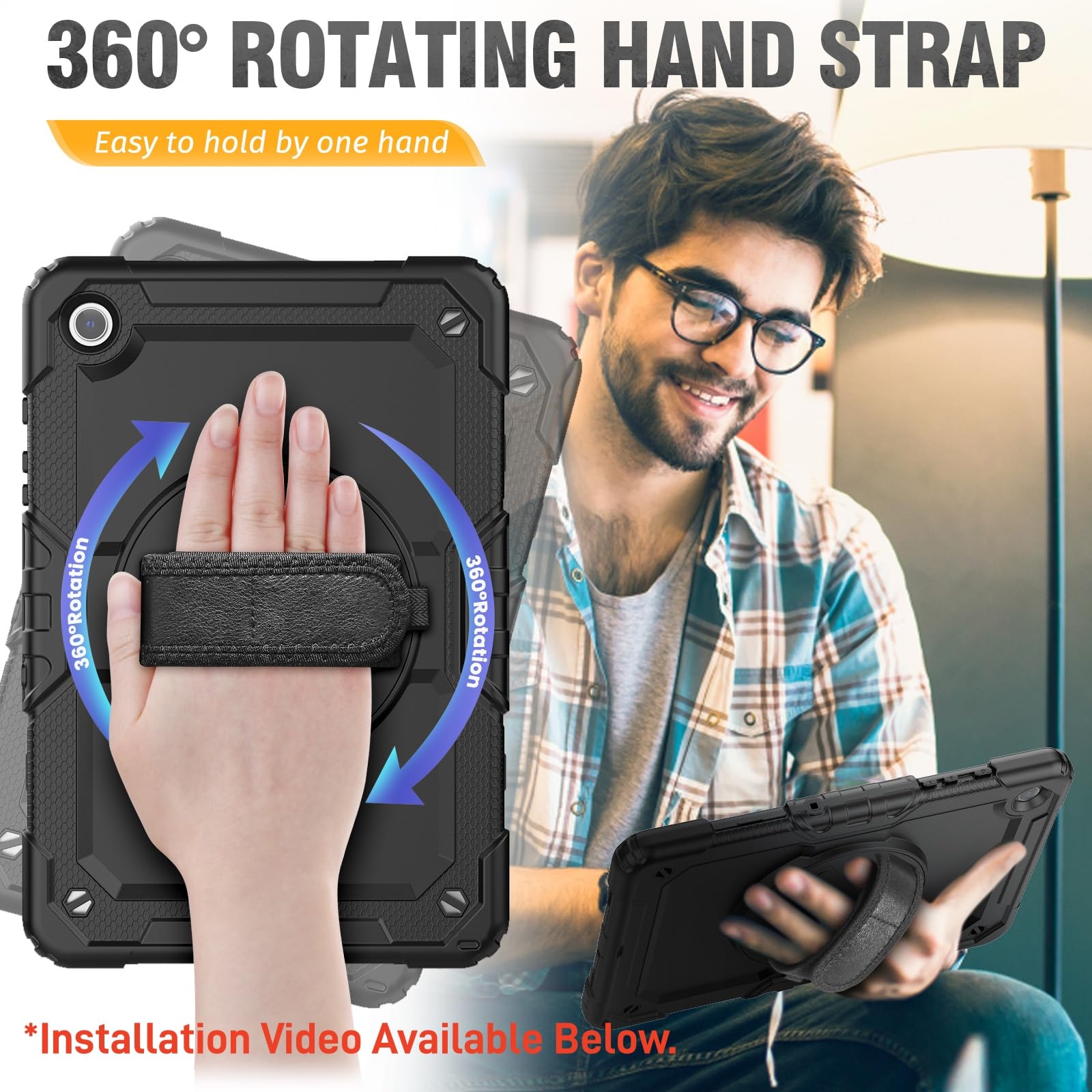 360° Rotating Stand & Hand Strap — The adjustable stand provides a stable support on viewing/drawing/typing angles. The Hand Strap allows you hold it safely by one hand, Perfect for use your tab while lying down or sitting.