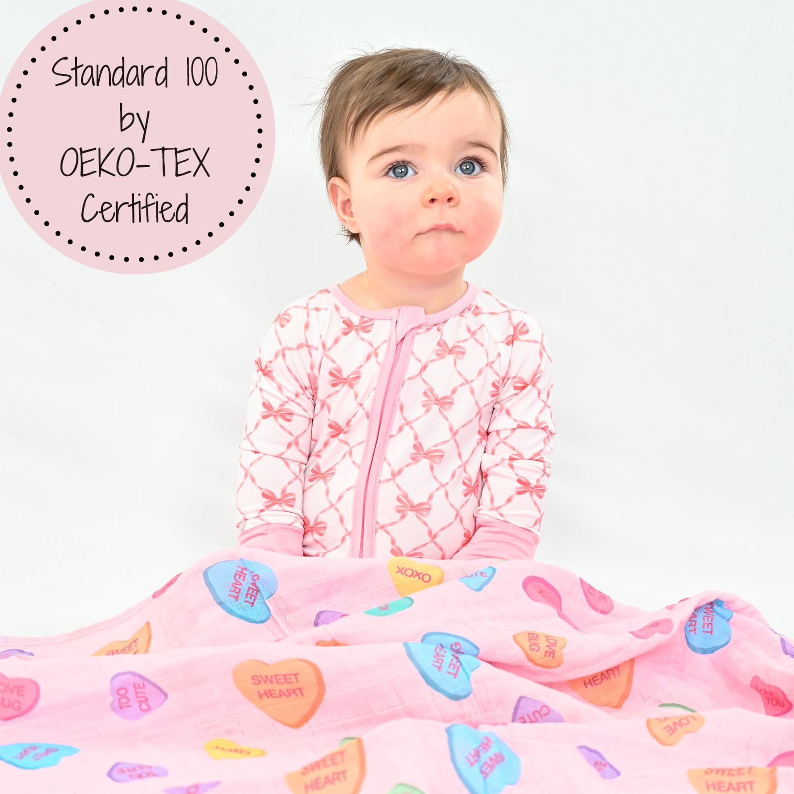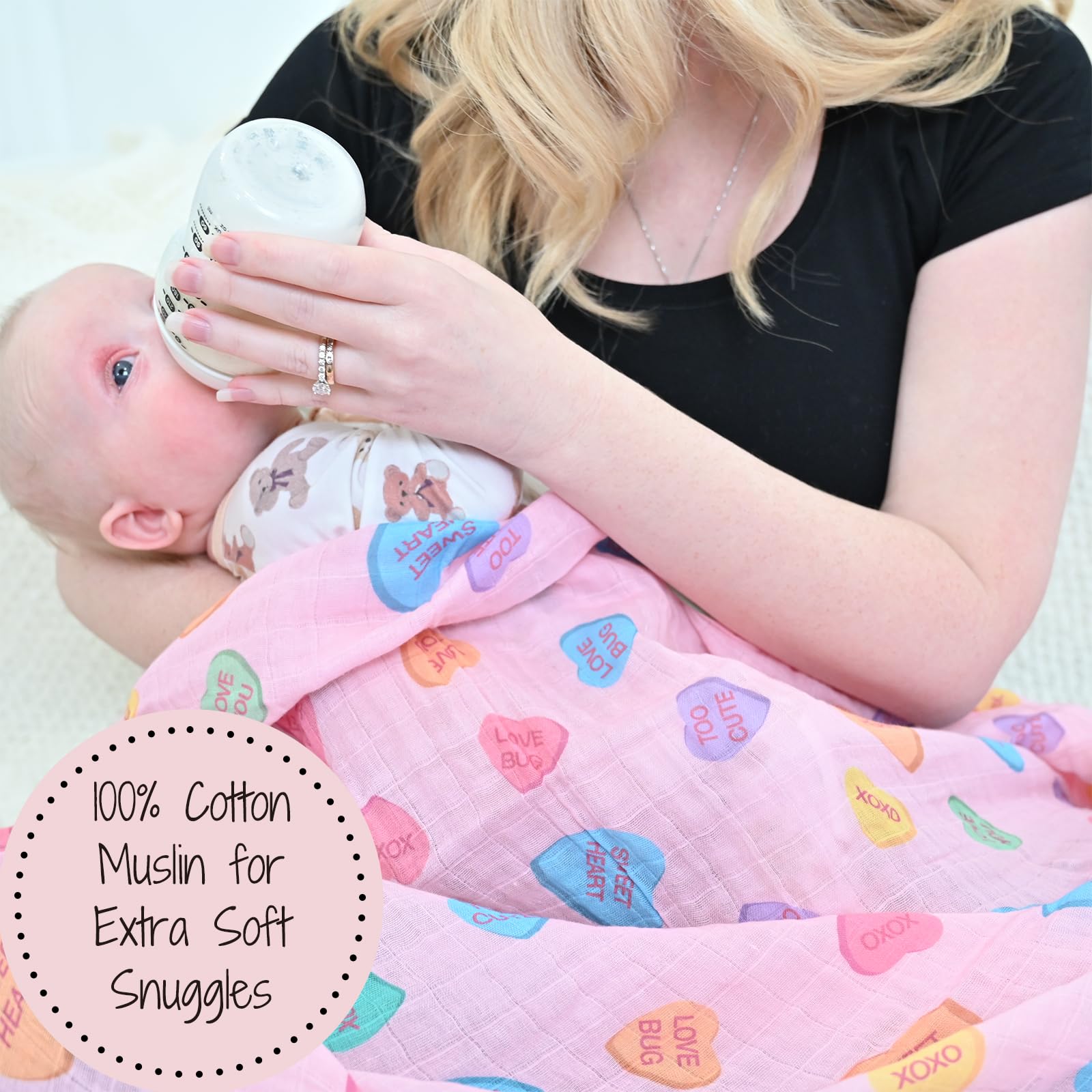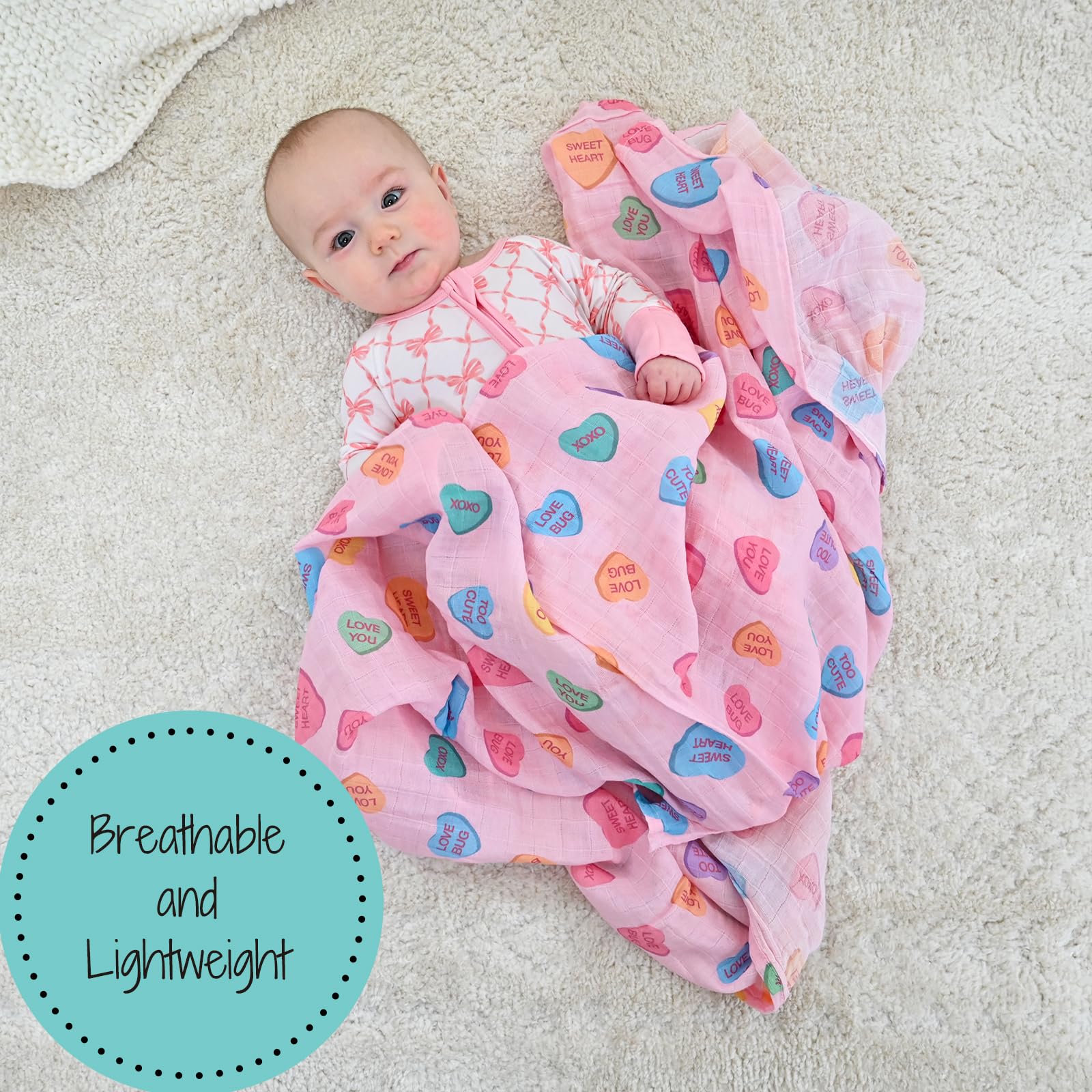 SWEETHEART LETTERS - Wrap your baby in a muslin swaddle blanket covered with heart-shaped letters, making every snuggle feel like a hug. Lightweight and breathable, it’s perfect for sharing love with a new little one.
