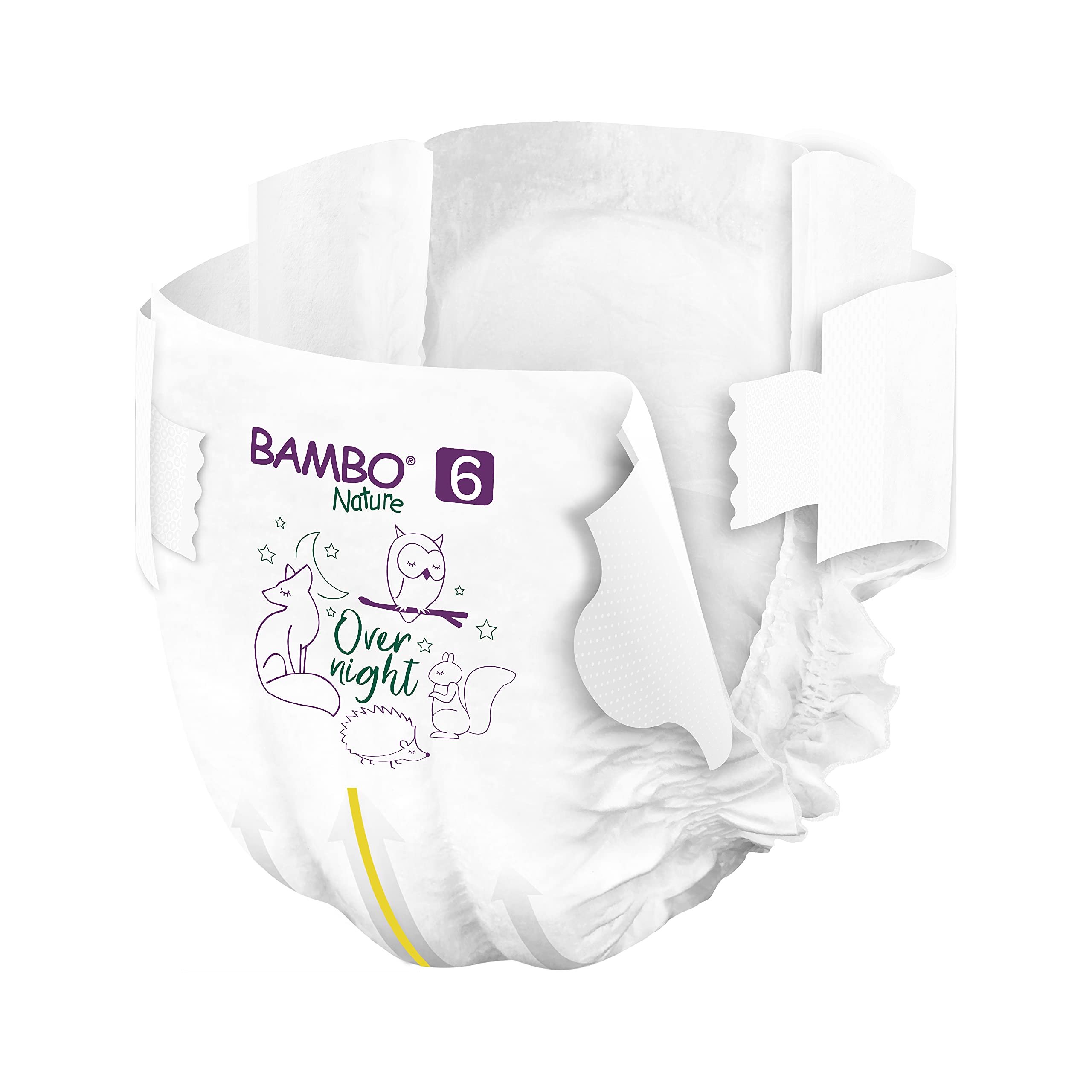 Bambo Nature’s Overnight Diapers are specifically designed for nighttime use. Our unique Channel Technology is meant to absorb large volumes of liquid incredibly fast so that your baby can stay dry and comfortable all night long! Our superior disposable overnight diapers are eco-friendly, certified skin-safe, free of harmful chemicals and all known allergens - making them perfect for baby’s sensitive skin. The flexible latex-free leg cuffs and waistband provide an extra leakage barrier designed to stay in place throughout the entire night, even when your baby moves around in their sleep. A premium overnight diaper means more Zzz’s for the whole family!