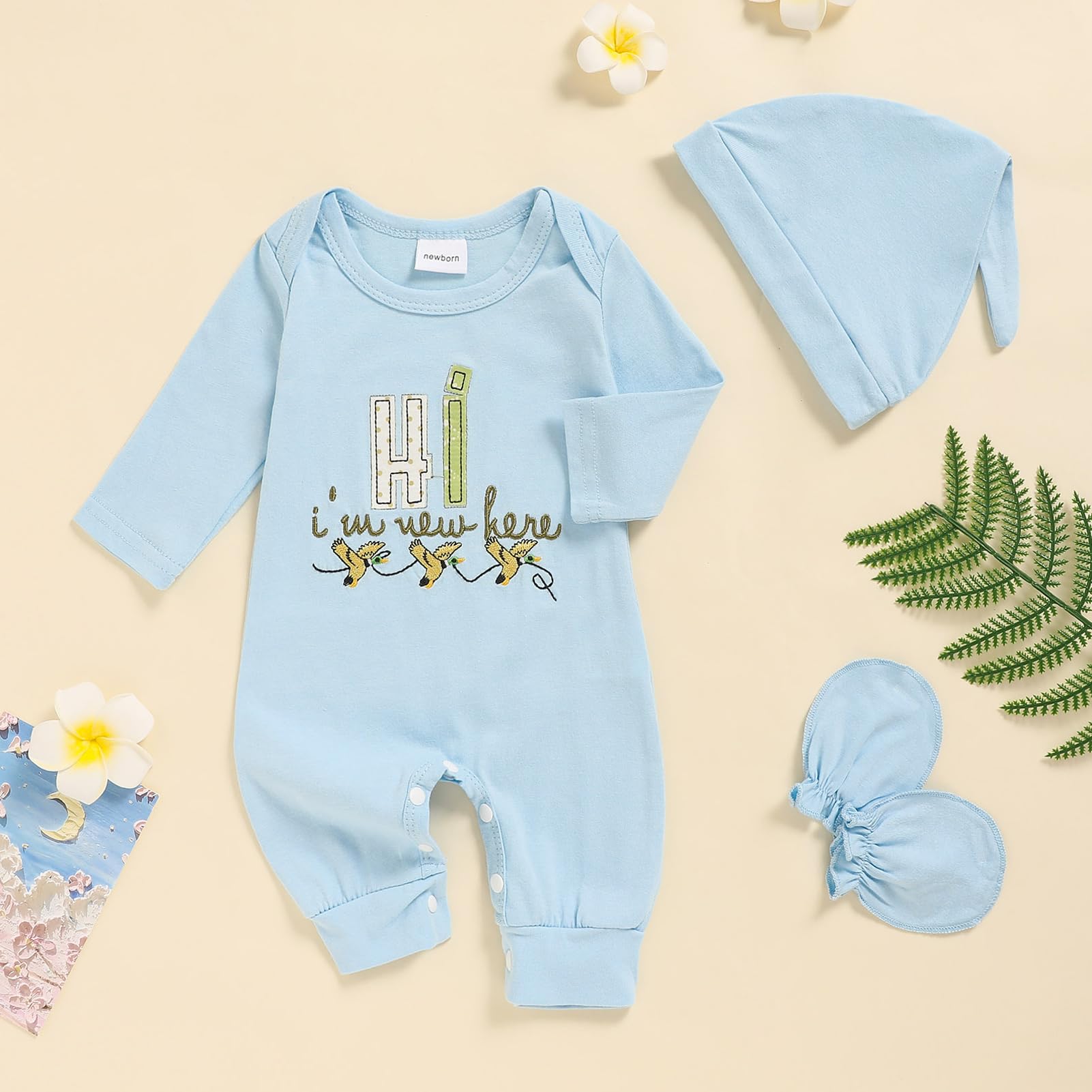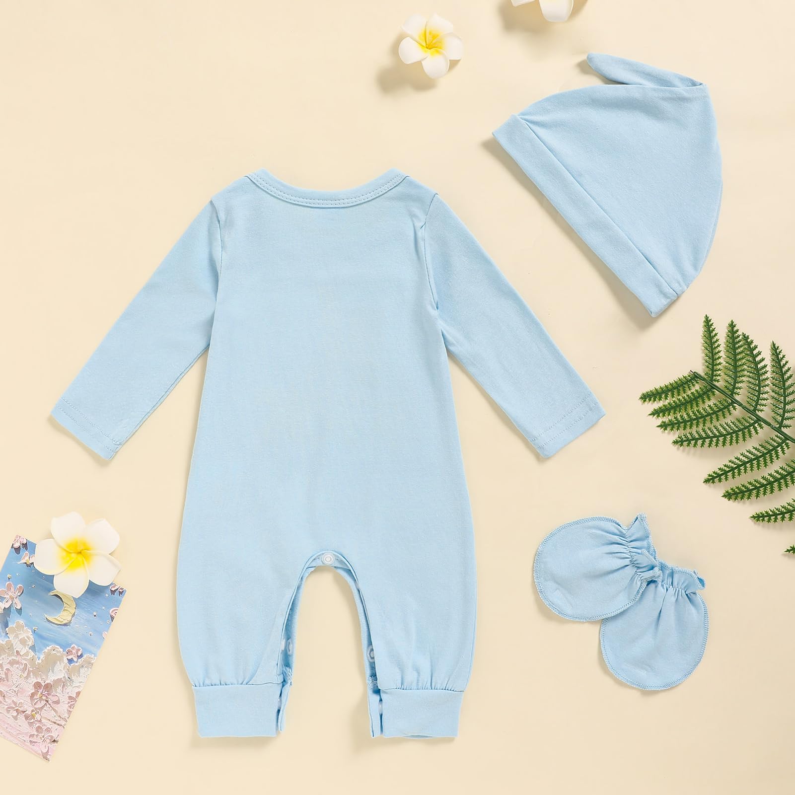 【NEWBORN BABY OUTFITS SET】Best gift for newborn boy coming home outfits.Brand New baby newborn boy long sleeve jumpsuit and 1 pairs of scratch-prevention gloves, Matching lovely baby hat comfortably fit round your little darling's head, make your little boy more handsome and cute,quality is the first thing we can make sure.