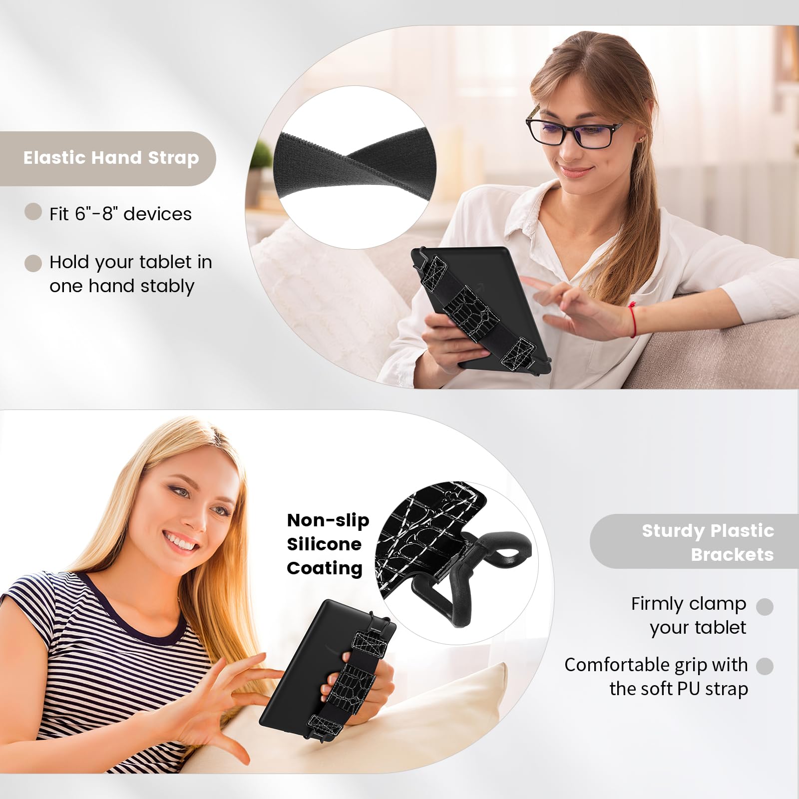 Compatibility: Universal hand strap holder with high durability and elasticity to fit 6 - 8" E-Reader and tablet, including Fire Tablet/Kindle/Kobo Nia/Kobo Clara HD/Lenovo tab M7/tab M8/Voyaga/Sony/Tolino tablet, etc. (Note: Please measure your e-book readers or tablets before purchase.)