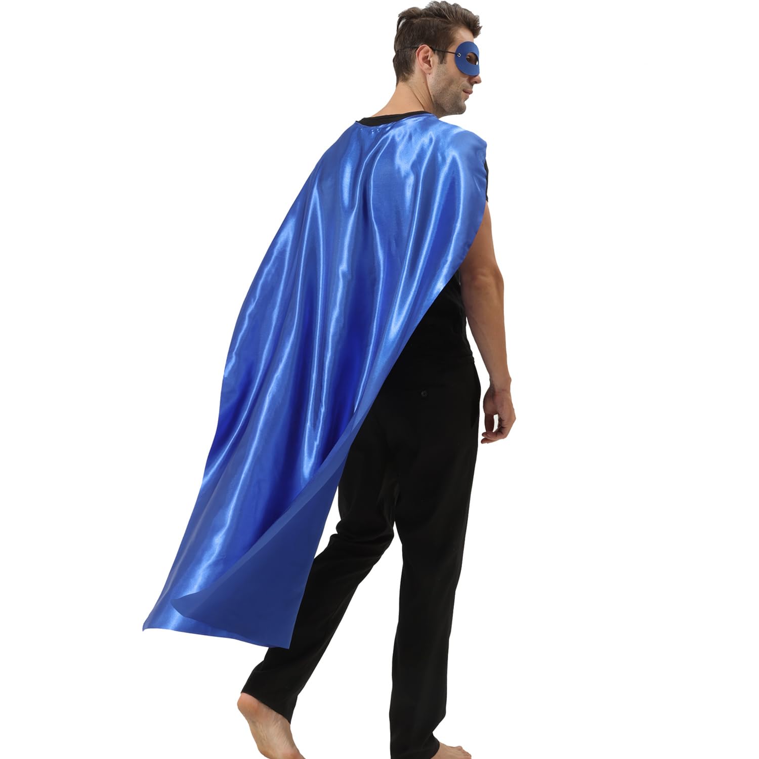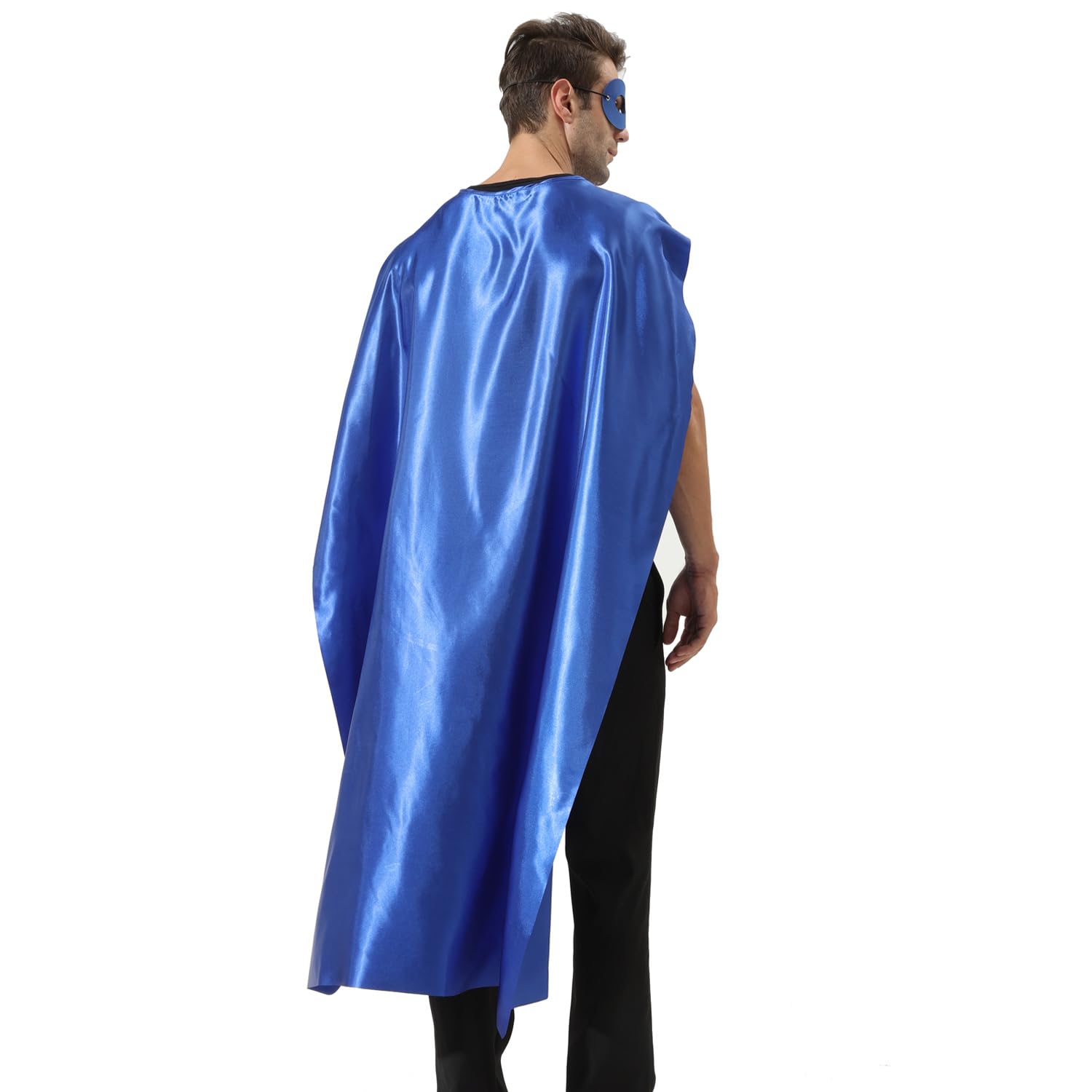 Size:Length 57 x Width 38 inch for capes. Our superhero capes and masks for adult bulk pack, are designed in perfect size after plenty of test; We have round neck hole, which fits better than simply sewed straight fabric with elastic. You can tie a bow with the cord to fit easily. The masks ensure a snug with elastic but not too tight fit.