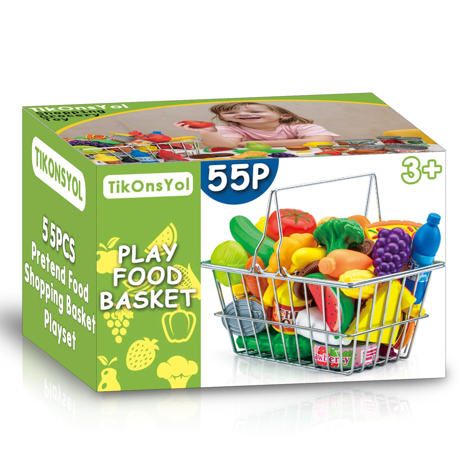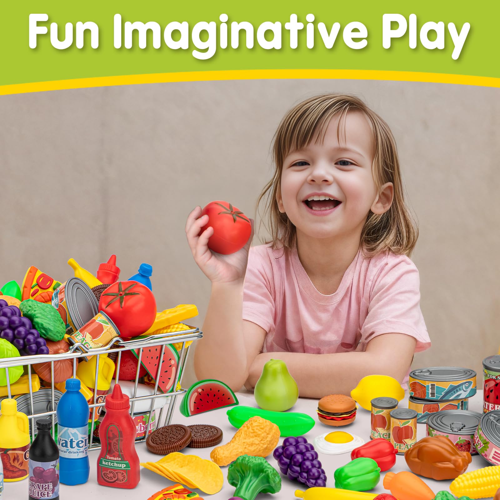 ENDLESS PRETEND PLAY: Contains over 55 realistic toy food and grocery products for creative role play including canned goods, drinks, snacks, produce, baked goods and more.