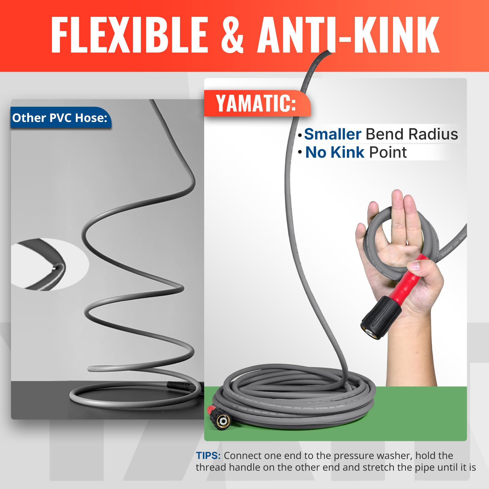 TOP FLEXIBILITY Based on Industry Engineering, made of creative high-quality and fantastic flexible material. 75 FT YAMATIC power washer hose,KinK Resistant, easy to carry, drag, roll up and store, will bring a lot of convenience to your pressure washing work.