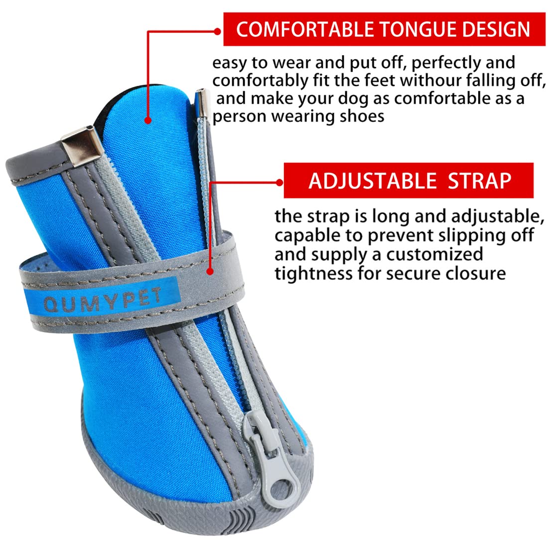 Convenient and Secure: Zip and self-adhesive strap design for manual adjustment, easy to put on / off. These small dog shoes expand with adjustable and reflective straps to ensure a tight fit, also make your puppy safe at night, and easy to find it when it lost
