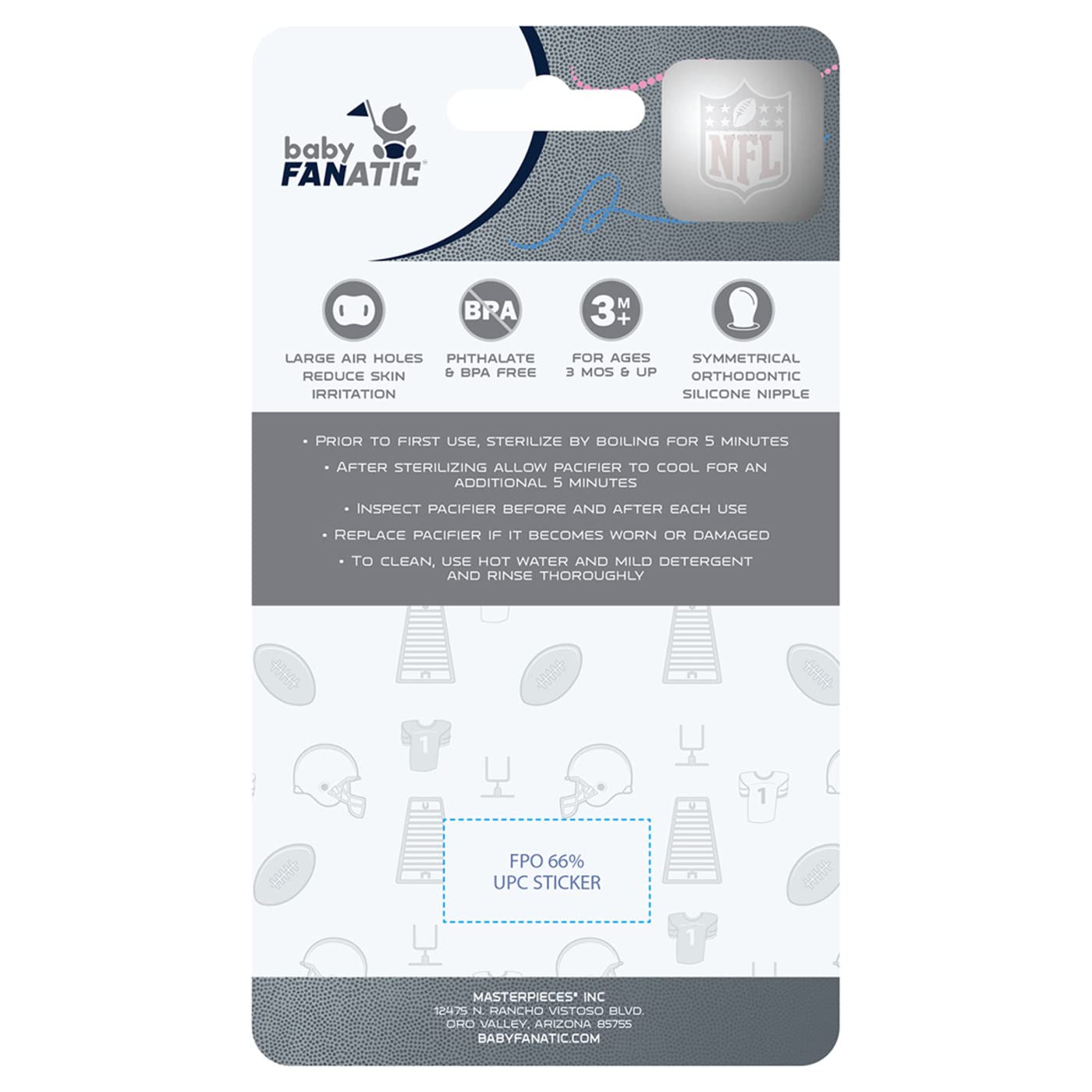 Description Soothe your little fan with officially licensed pacifiers. These orthodontic pacifiers feature a silicone nipple and plastic shield. The team logo is adorned on the "button" with team colors decorating the shield. All items have been quality and safety tested to be 100% BPA free. For over 15 years, Baby Fanatic has been the premier manufacturer of officially licensed NFL, MLB, NHL, NBA and Collegiate baby and toddler products. Grown from a love of kids and sports, we offer unique childrenβs goods of the highest quality to fans everywhere, bringing them together with friends and family. Looking for the perfect baby gift for a fellow sports fan? Consider Baby Fanatic's one-stop-shop for quality licensed baby goods.