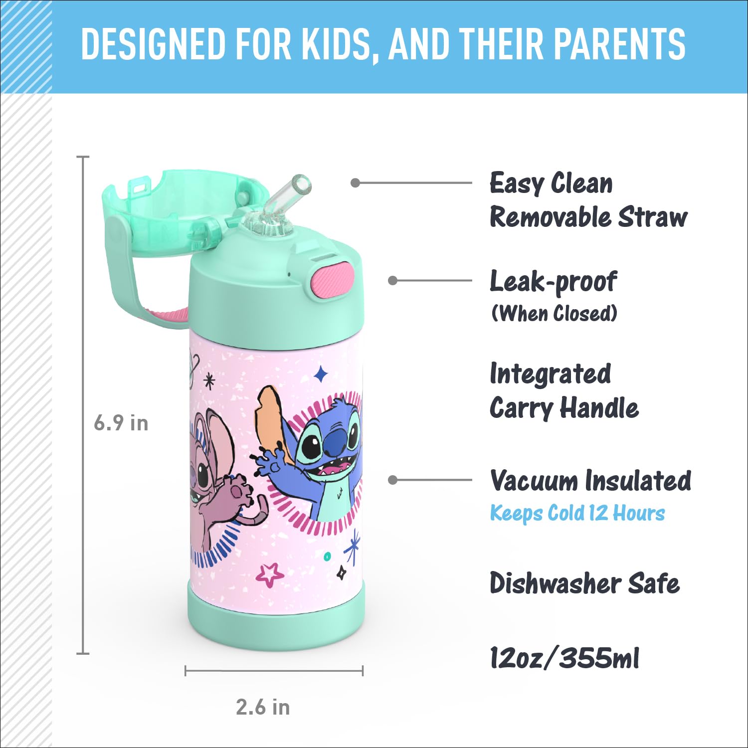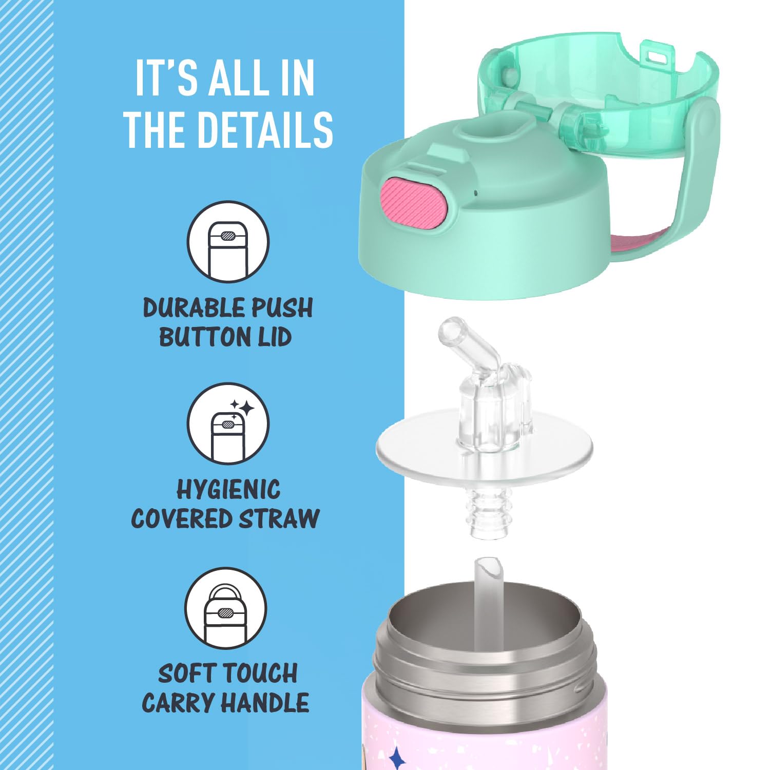 Easy care and cleaning: Hygienically covered pop-up straw that’s also removable for easy cleaning. This kids water bottle is dishwasher safe, though washing by hand is recommended.