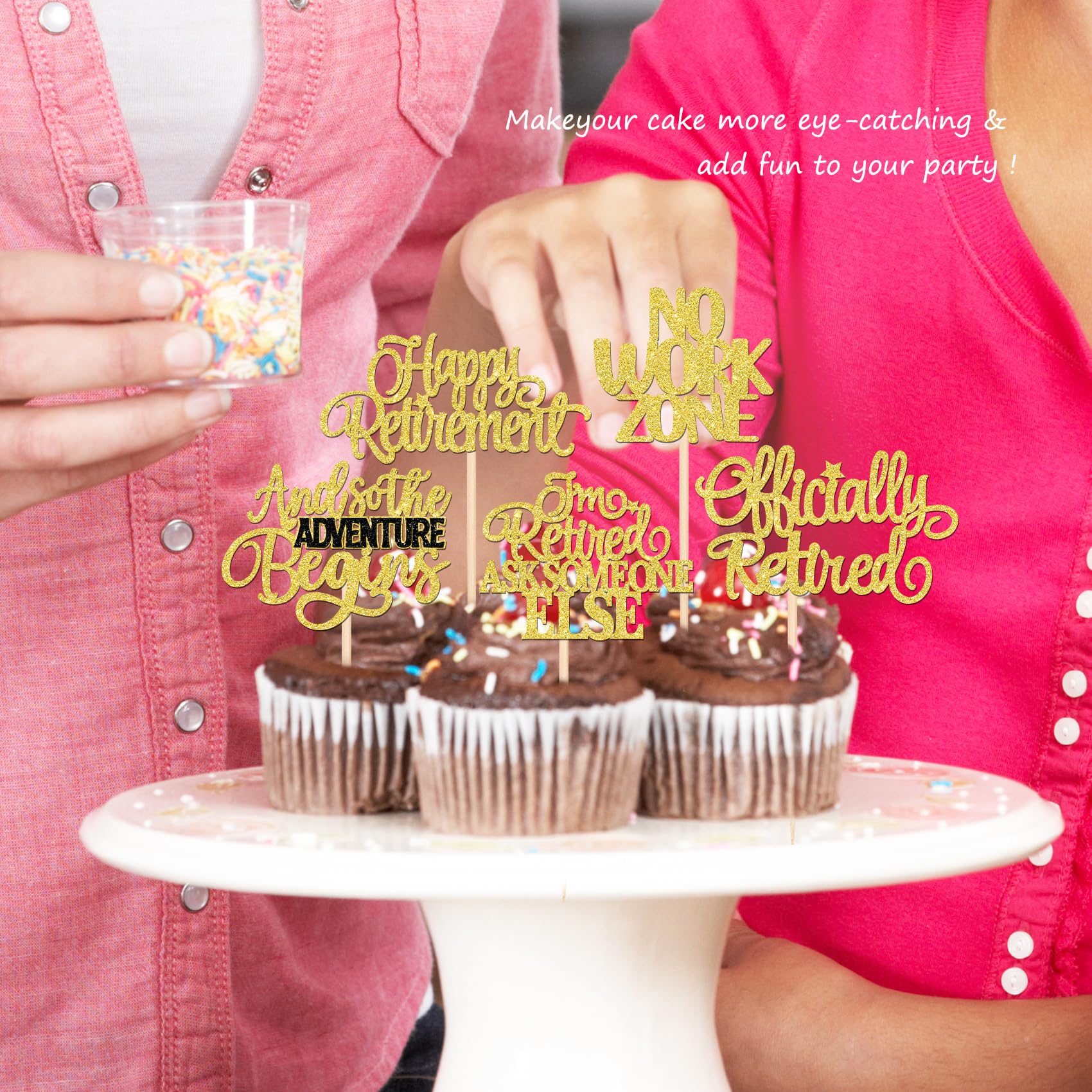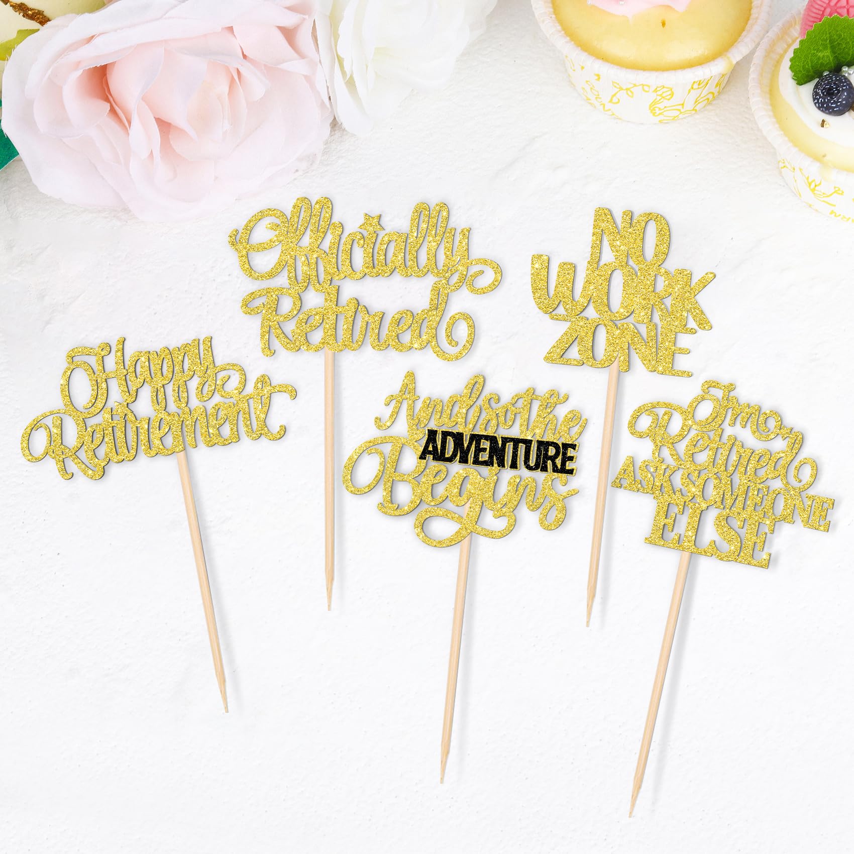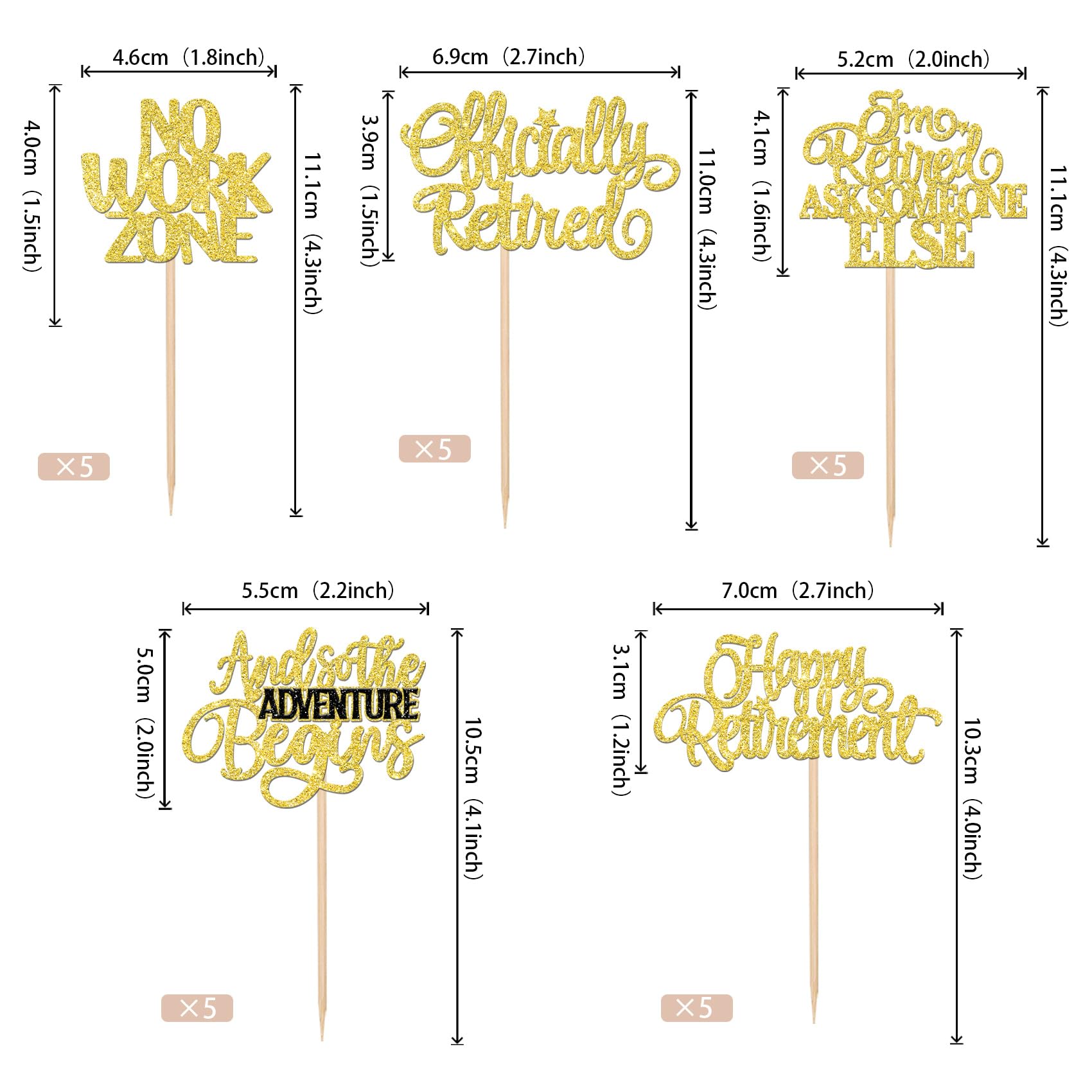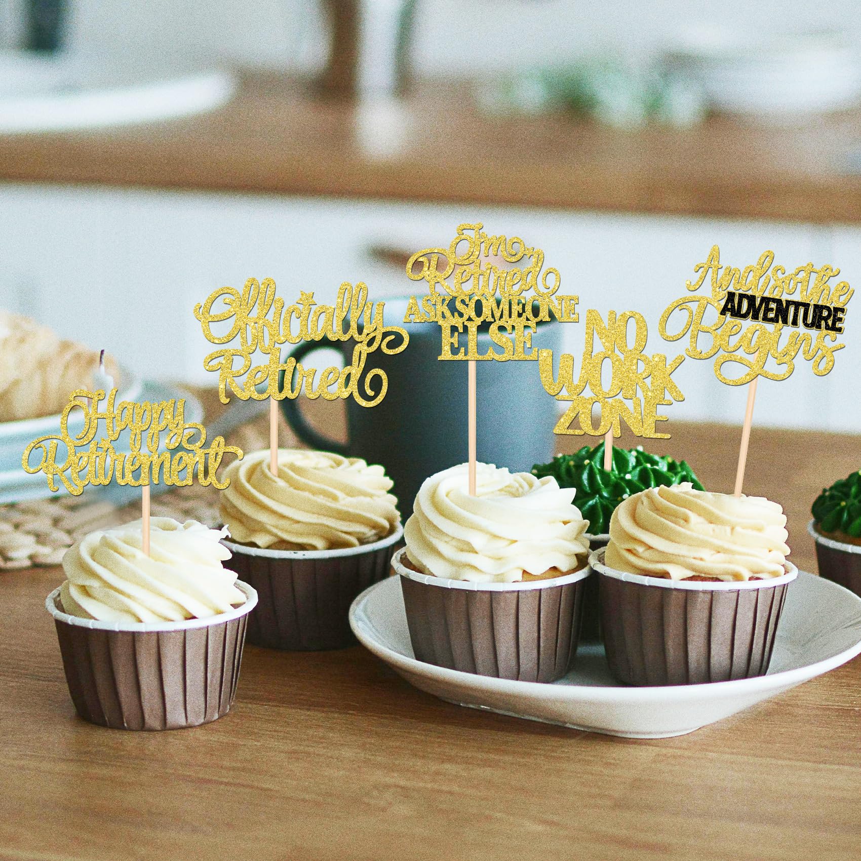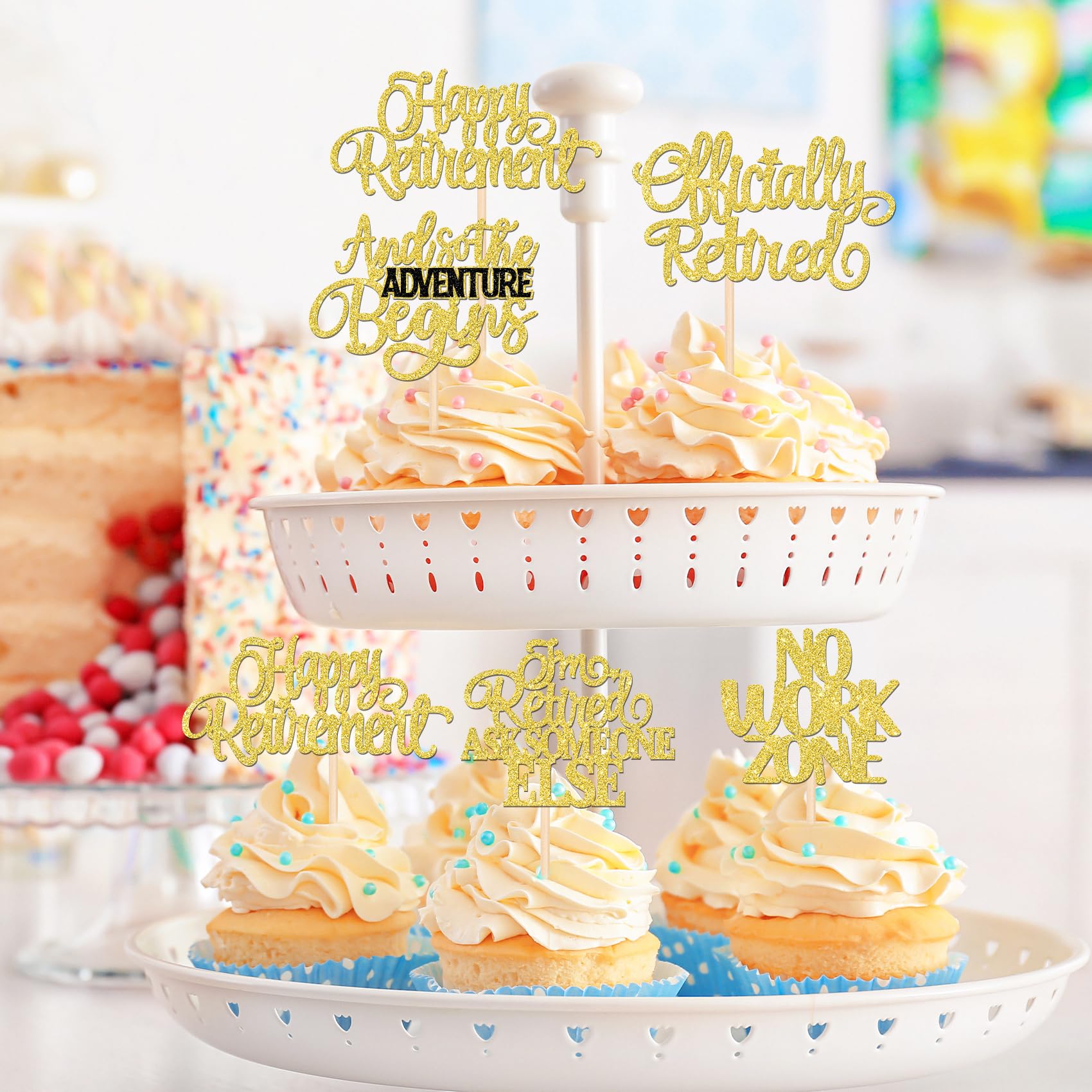Happy Retirement Cupcake Toppers Officially Retired No Work Zone Adventure Begins Cupcake Picks for Retirement Theme Farewell Birthday Party Cake Decorations Supplies Perfect for happy retirement theme party, official retired theme party, no work zone adventure begins theme party, I'm retired theme party cupcake decorations supplies. Pack of 30 pcs,6 pcs of each design. The size is 1.8 *4.3 inch / 2.7*4.3 inch / 2*4.3 inch / 2.2*4.1 inch / 2.7*4 inch ( with stick ) Made of high quality paper card stock and food grade sticks,thick and sturdy. These cupcake toppers are single glitter, the back is white, and they are intended for decoration only, please do not put them in oven or microwave. If the item you received has any defects, please contact us for refund.we will deal with it within 24 hours.