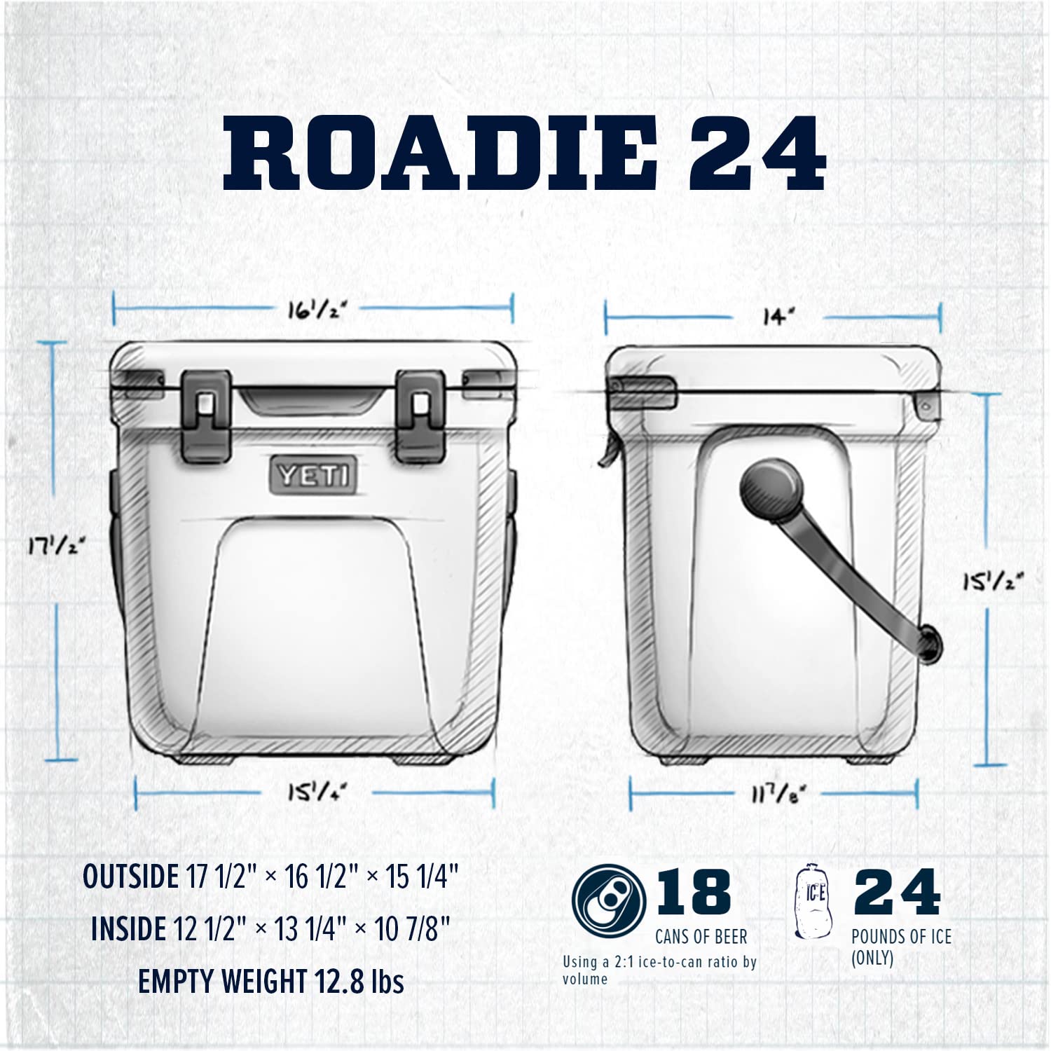 The Roadie 24 holds 18 cans with a 2:1 ice-to-can ratio or 24 lbs of just ice. It measures 16 1/2” L × 14 1/2”W × 17 1/2” H