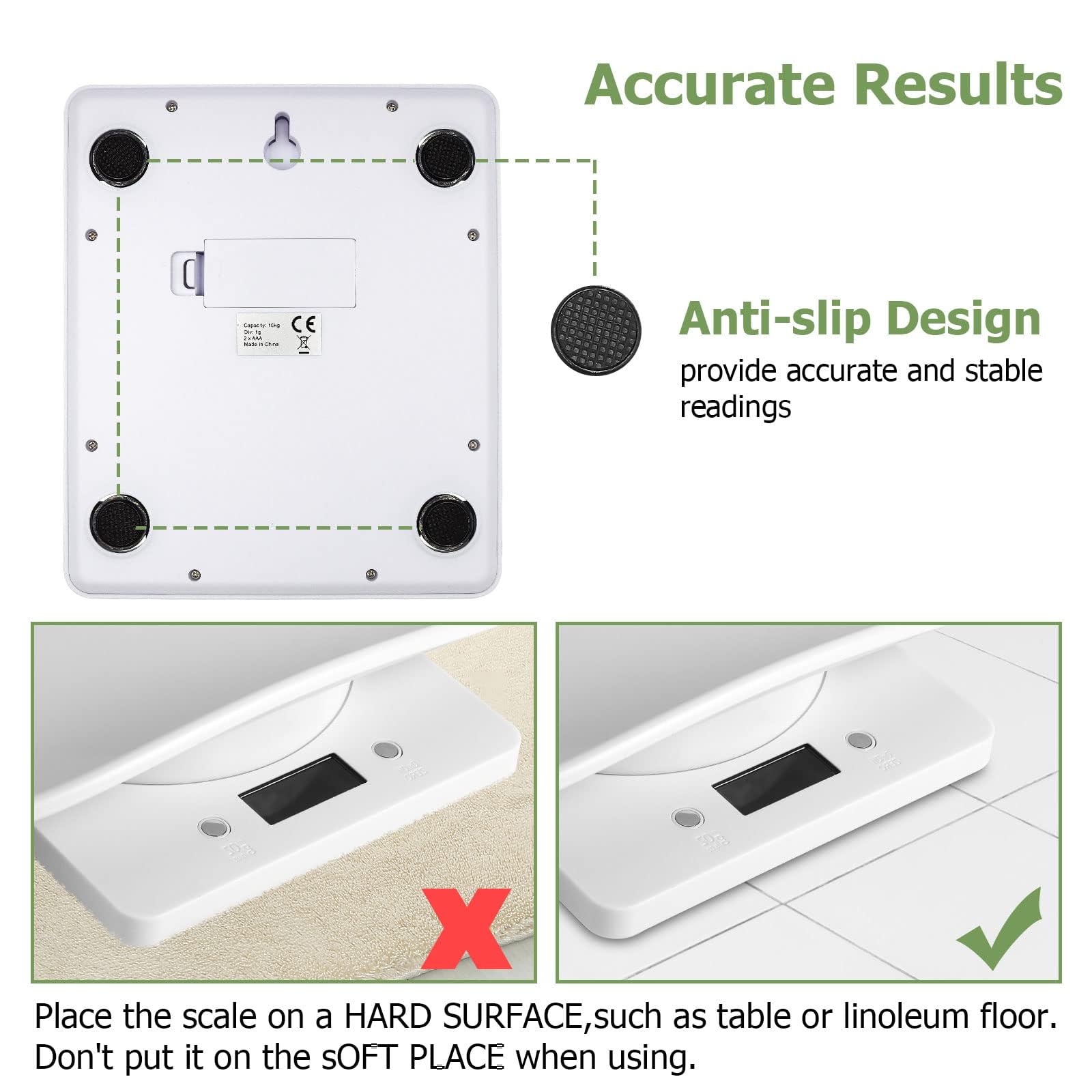 ๐พใPlease Noteใ- Place the scale on a HARD SURFACE, such as table or hard floor when use. If your pet is large or unable to be fixed(Weighs less than 33lbs), you need to add a container, put the pet in it first, and then perform the weighing measurement.
