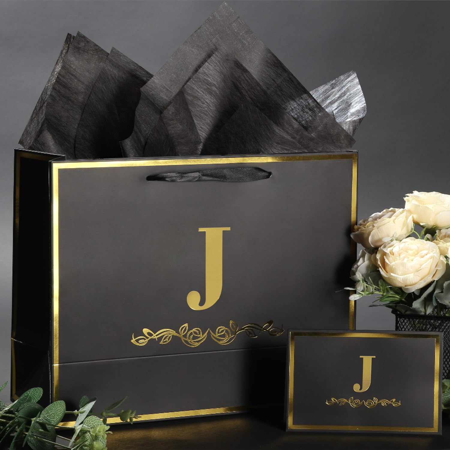 Alphabet Birthday Gift Bag with Card and Tissue Paper for Men Women, 13" Large Black Gold Personalized Horizontal Paper Bag for Gifts Wrapping - (Letter J)