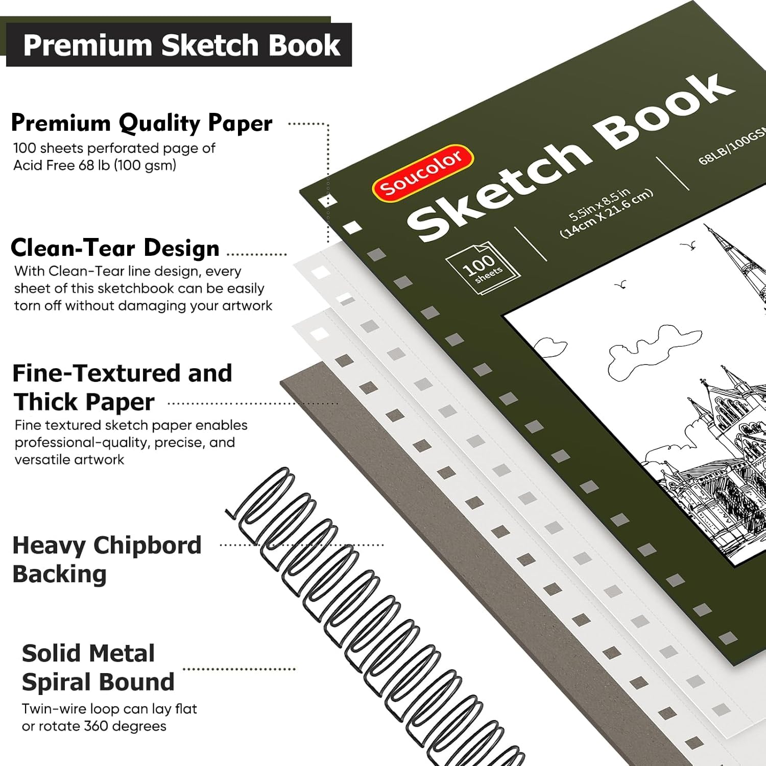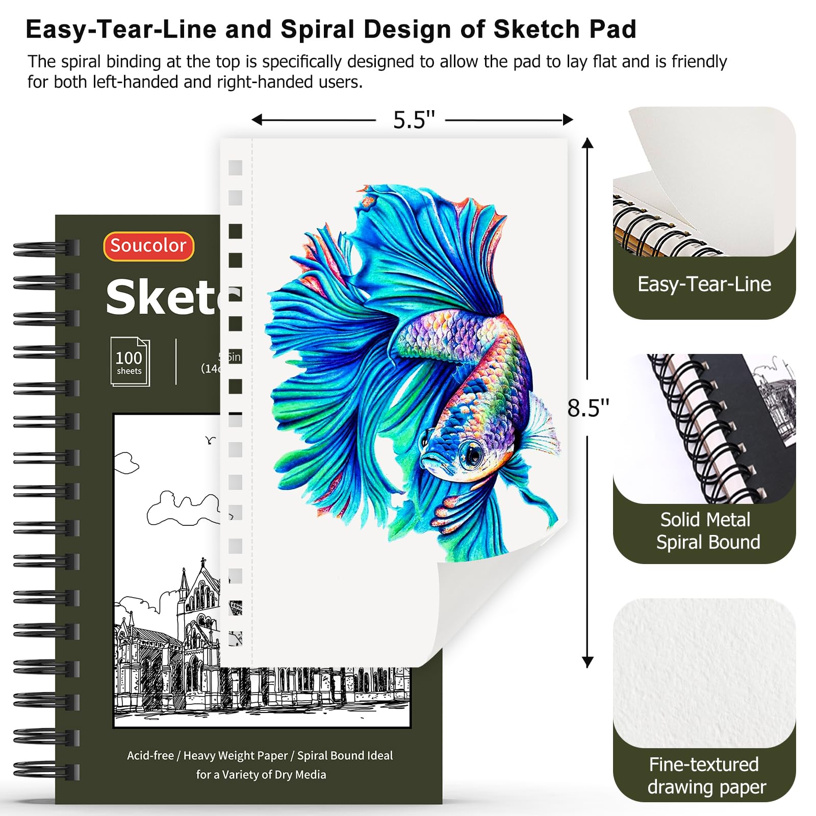 【Sturdy spiral bound on the top and micro-perforated paper】The top spiral binding is nice and friendly for both left-handed and right-handed people, allows for pad to lay flat when opened and for easy page-turning. With the thick cardstock cover and heavy backboard for extra protection, it will keep the paper in good shape all the time, provide better drawing & writing experience. Every page is micro-perforated, allows you to easily remove single page.