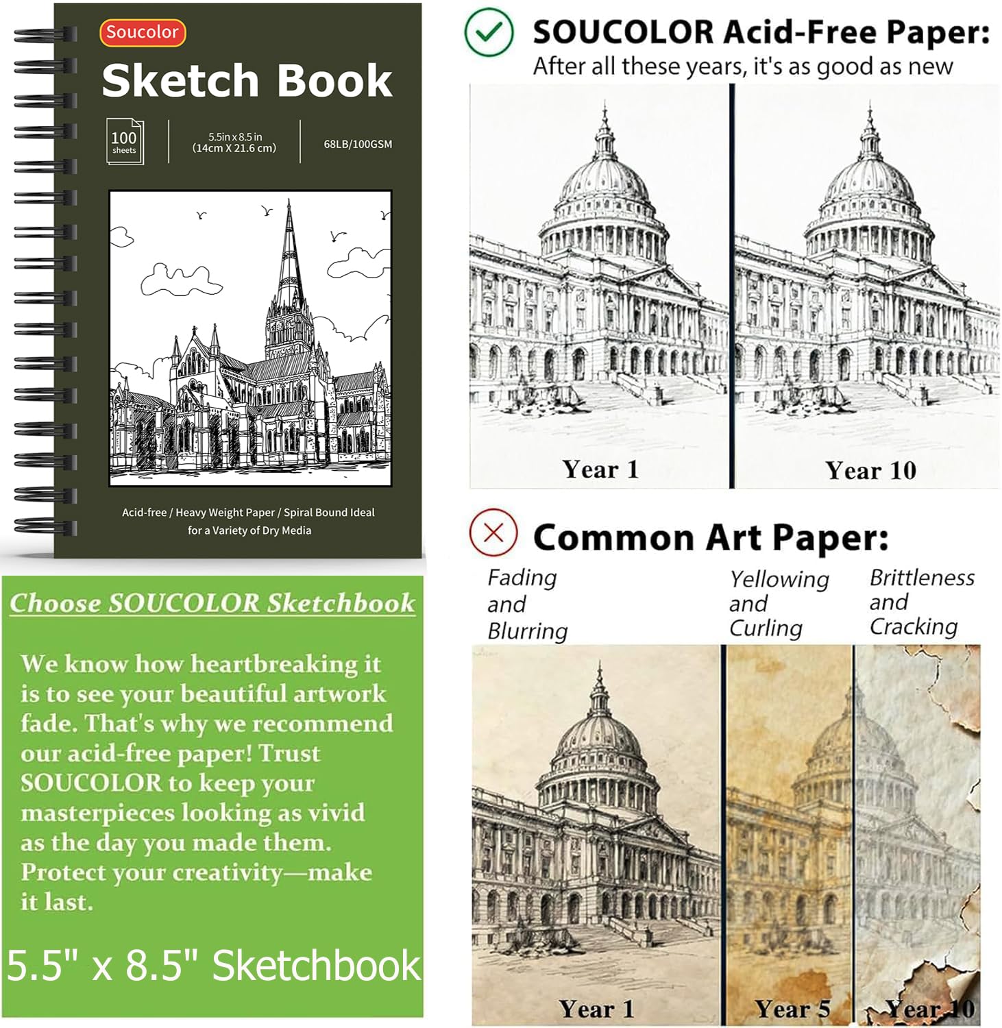 【High-quality sketching drawing book journal pad】This sketching notebook paper is acid-free and PH neutral with standard-weight 68lb/100gram, which is much thicker and better than the similar sketchbook from other brands. It prevents bleeding, smudging and feathering for clean artwork. Keep your artwork looking great for years to come!
