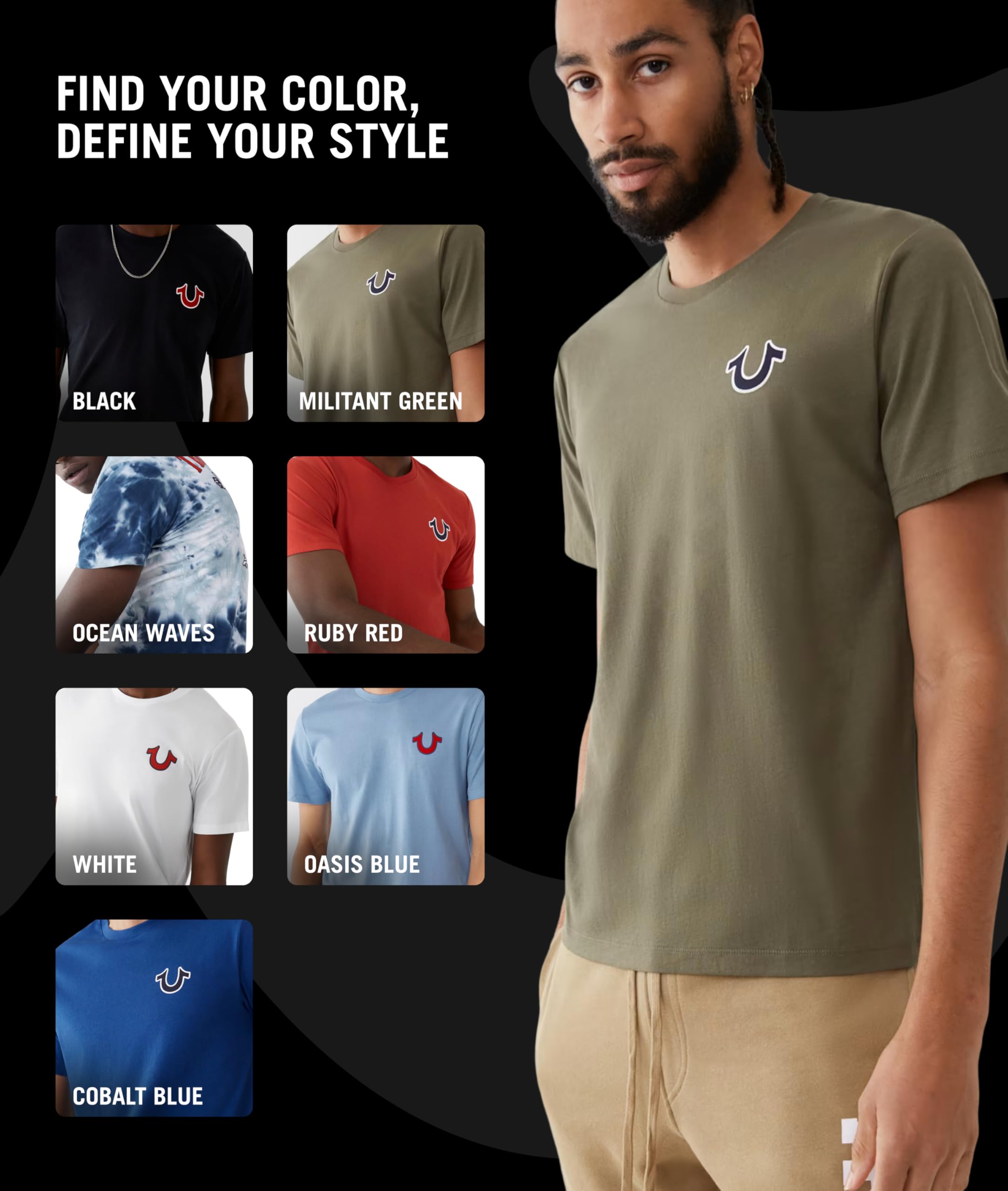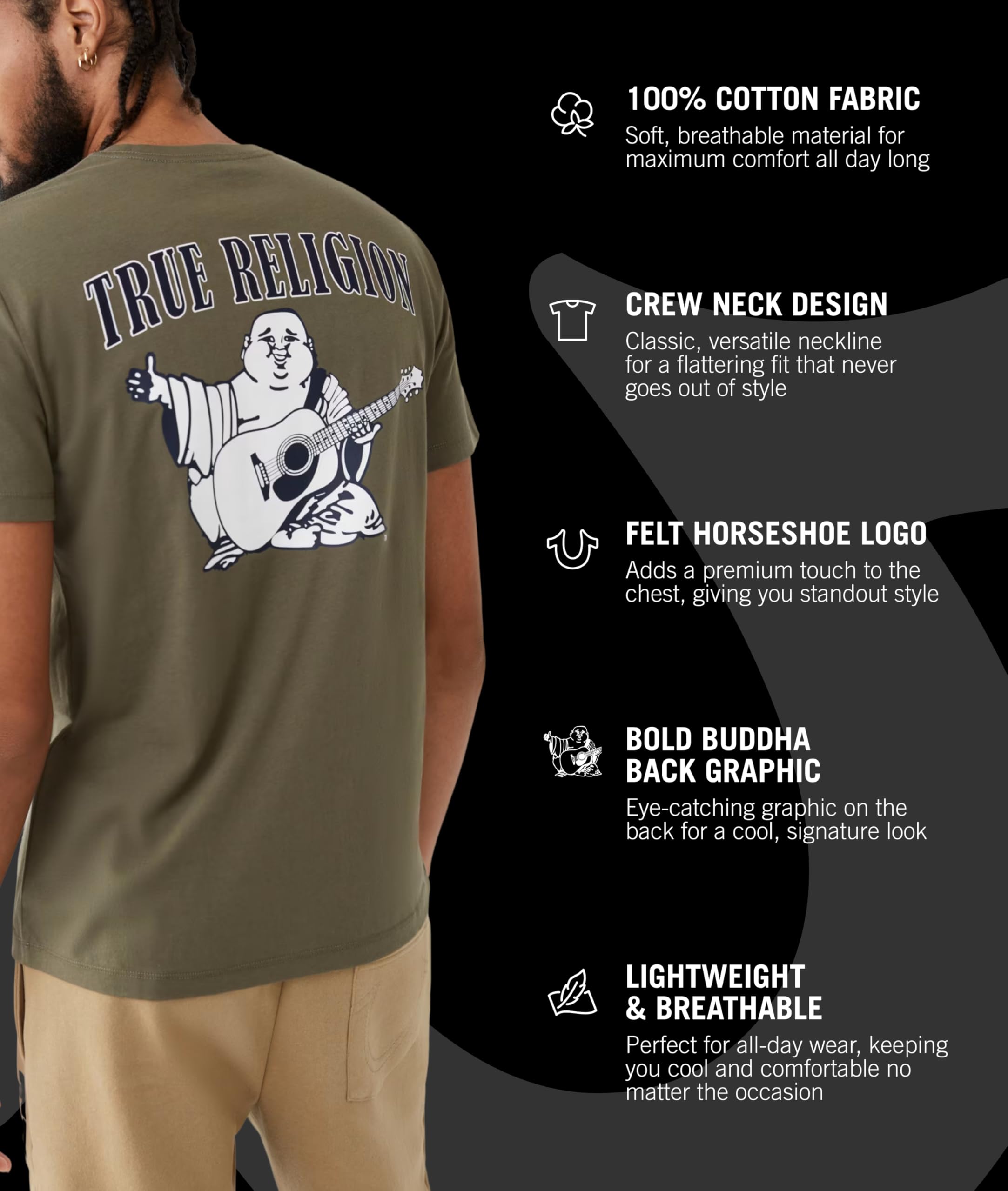 Description The True Religion Men’s Buddha Logo Crew Neck Tee Shirt is a wardrobe essential in t shirts for men, combining comfort, quality, and iconic style. Crafted from 100% cotton, this tee is lightweight, soft, and durable. With a classic crew neck and short sleeves, it offers a reliable fit that works for every occasion. Featuring a horseshoe chest logo and bold Buddha back graphic, it delivers distinctive style compared to ordinary graphic tees for men. Perfect as an everyday essential, this tee pairs effortlessly with jeans, joggers, or layered under a jacket. True Religion is known for mens t-shirts that balance durability and standout design, and this one is no exception. Available in multiple colors and all sizes, it’s built to be worn on repeat.