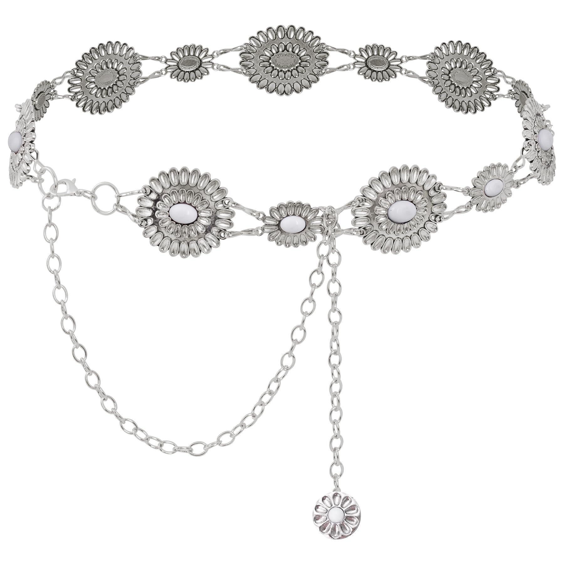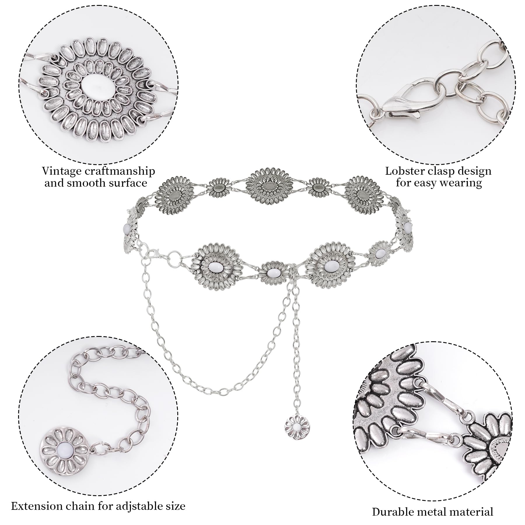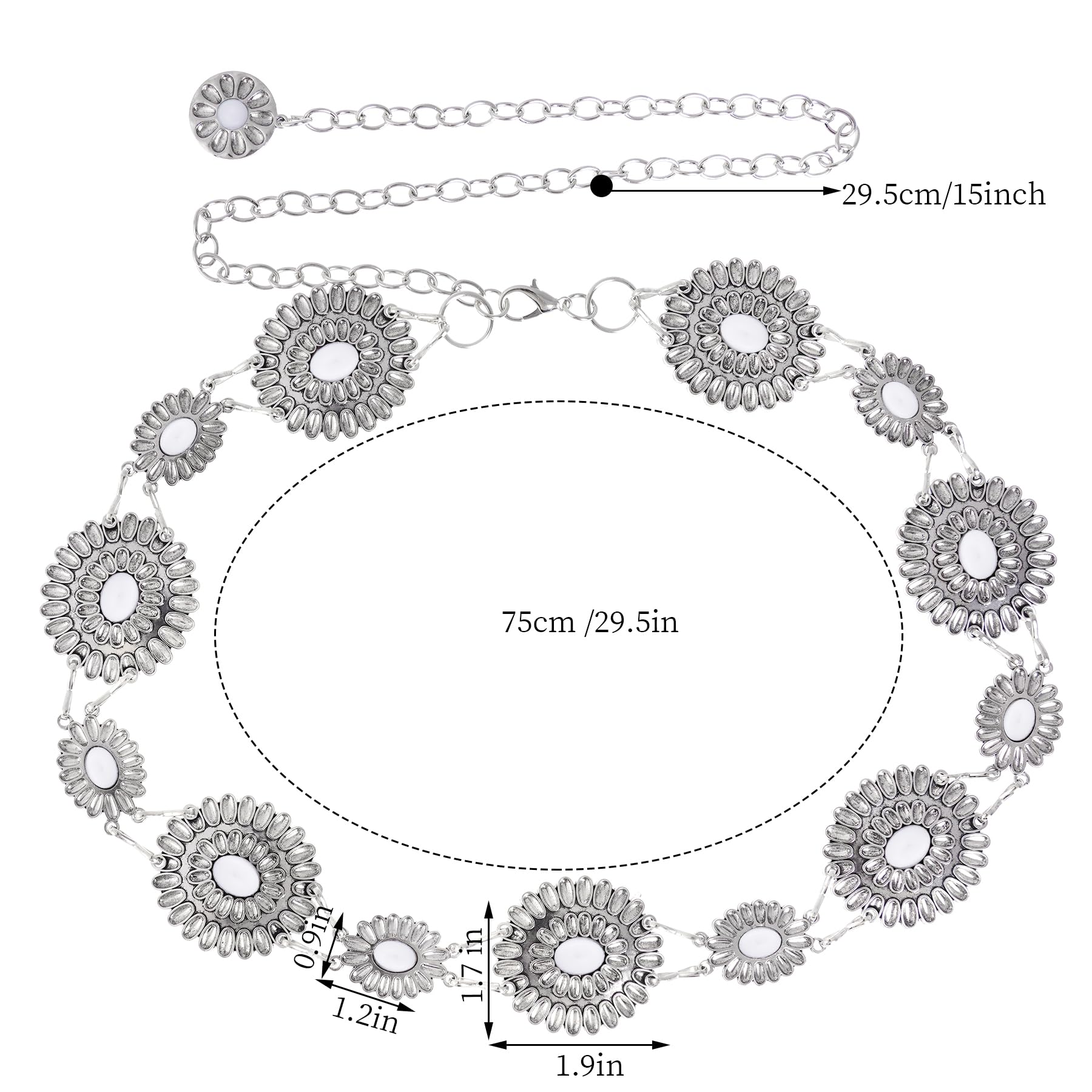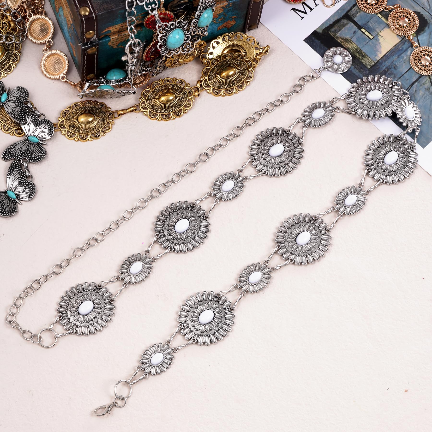 Adjustable Western Metal Concho Belt for Women: The adjustable metal waist belt for dresses jeans length about 73 cm / 28.7 inch with 47 cm / 18.5 inch extension chain. Silver turquoise chain belts fit for most women girls waist, add Western boho style charm, match any outfit.
