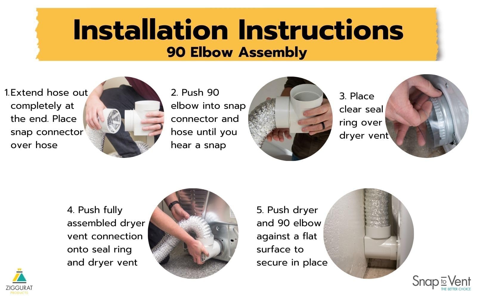 🟨 90Β° ELBOW PUSHED AGAINST WALL– The Snap to Vent 90-degree elbow must be installed flush against the wall to lock securely and maintain proper airflow. This positioning prevents disconnection and ensures long-term performance. If it is not pushed up against a wall you can use HVAC tape to secure the 90 elbow to the vent.